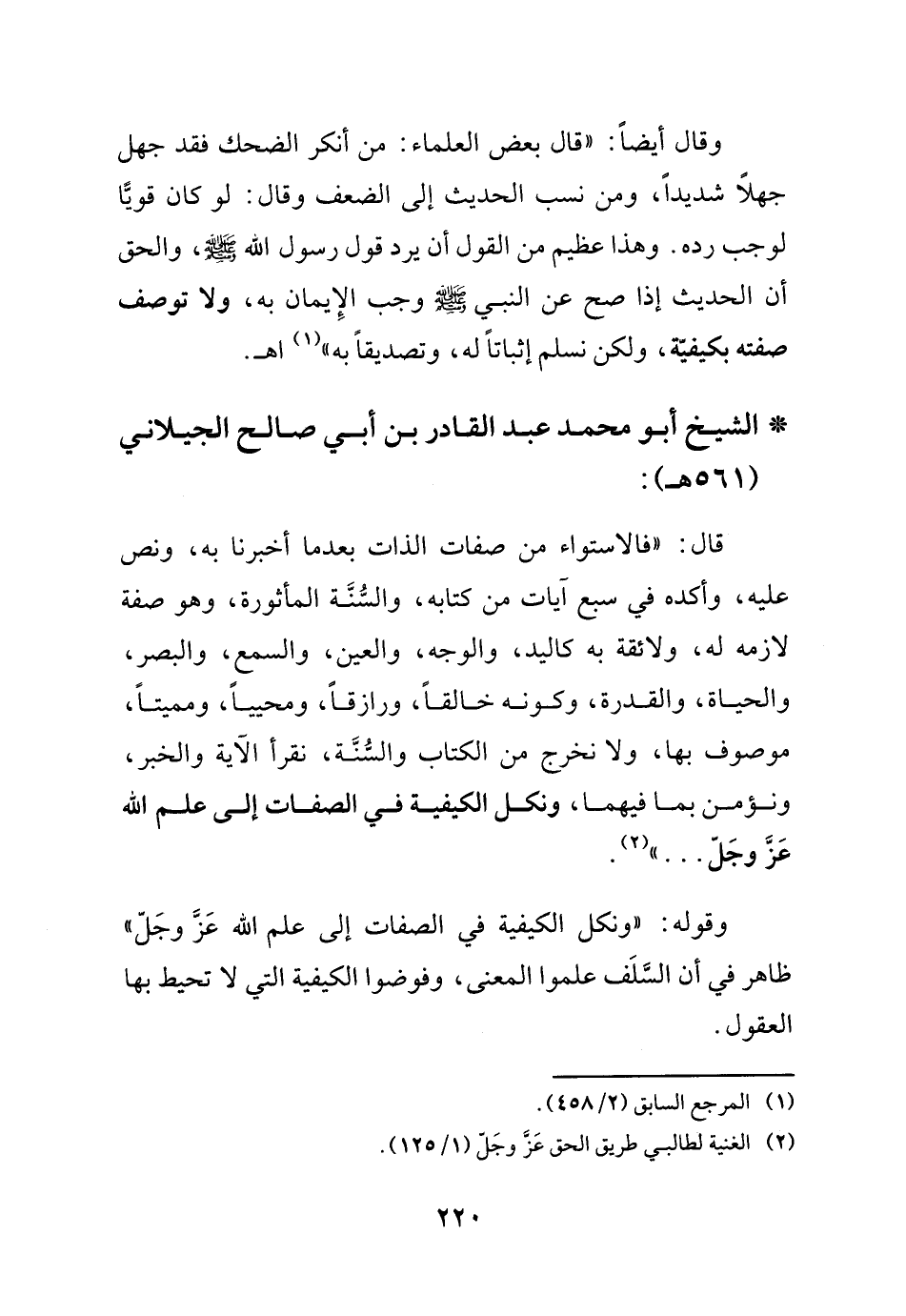 وقال أيضاً: (قال بعض العلماء: من أنكر الضحك فقد جهل جهلاً شديداً، ومن نسب الحديث إلى الضعف وقال: لو كان قوياً لوجب رده. وهذا عظيم من القول أن يرد قول رسول الله - صلى الله عليه وسلم -، والحق أن الحديث إذا صح عن النبي - صلى الله عليه وسلم - وجب الإيمان به، ولا توصف صفته بكيفية، ولكن نسلم إثباتاً له، وتصديقاً به) (¬1) اهـ.