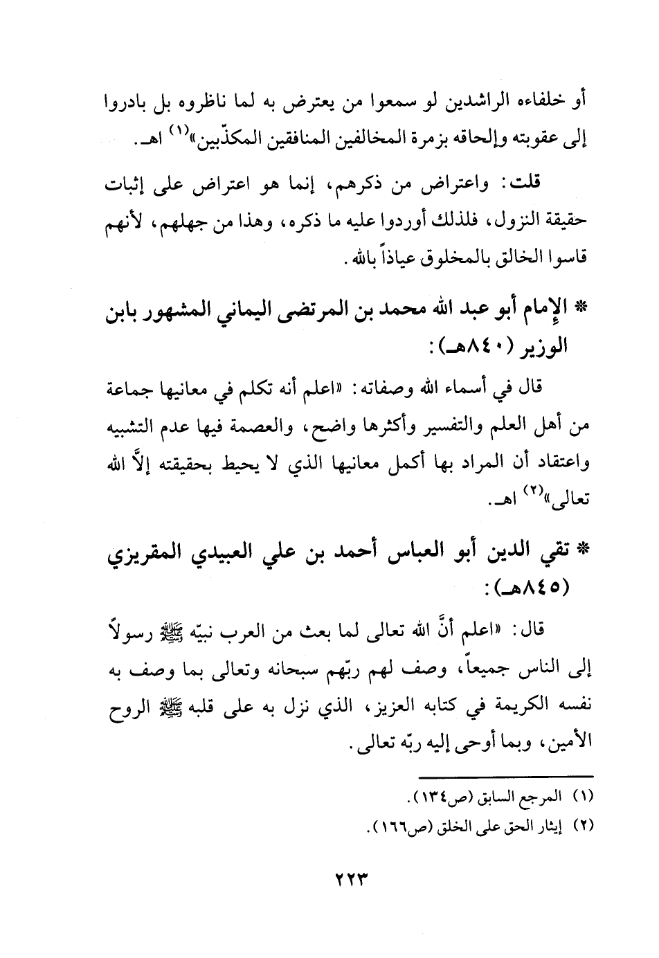 قال: (اعلم أن الله تعالى لما بعث من العرب نبيه - صلى الله عليه وسلم - رسولاً إلى الناس جميعاً، وصف لهم ربهم سبحانه وتعالى بما وصف به نفسه الكريمة في كتابه العزيز، الذي نزل به على قلبه - صلى الله عليه وسلم - الروح الأمين، وبما أوحى إليه ربه تعالى.