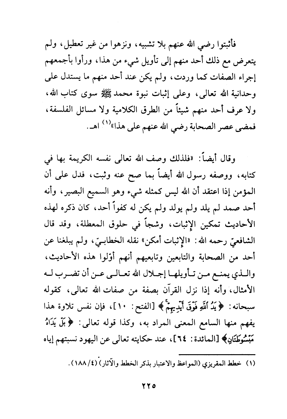وقال أيضاً: (فلذلك وصف الله تعالى نفسه الكريمة بها في كتابه، ووصفه رسول الله أيضاً بما صح عنه وثبت، فدل على أن المؤمن إذا اعتقد أن الله ليس كمثله شيء وهو السميع البصير، وأنه أحد صمد لم يلد ولم يولد ولم يكن له كفواً أحد، كان ذكره لهذه الأحاديث تمكين الإثبات، وشجاً في حلوق المعطلة، وقد قال الشافعيّ رحمه الله "الإثبات أمكن" نقله الخطابيّ، ولم يبلغنا عن أحد من الصحابة والتابعين وتابعيهم أنهم أوّلوا هذه الأحاديث، والذي يمنع من تأويلها إجلال الله تعالى عن أن تضرب له الأمثال، وأنه إذا نزل القرآن بصفة من صفات الله تعالى، كقوله سبحانه:"الله فوق أيديهم " فإن نفس تلاوة هذا يفهم منها السامع المعنى المراد به، وكذا قوله تعالى:"بل يداه مبسوطتان"، عند حكايته تعالى عن اليهود نسبتهم إياه