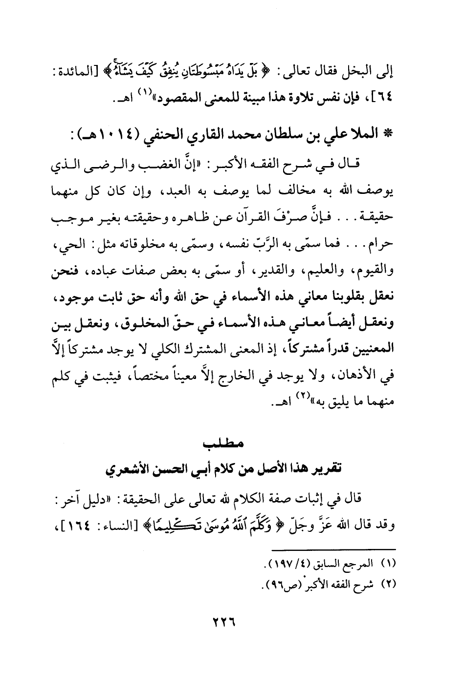 قال في شرح الفقه الأكبر: (إن الغضب والرضى الذي يوصف الله به مخالف لما يوصف به العبد، وإن كان كل منهما حقيقة ... فإن صرف القرآن عن ظاهره وحقيقته بغير موجب حرام ... فما سمّى به الرب نفسه، وسمّى به مخلوقاته مثل: الحي، والقيوم، والعليم، والقدير، أو سمّى به بعض صفات عباده فنحن نعقل بقلوبنا معاني هذه الأسماء في حق الله وأنه حق ثابت موجود، ونعقل أيضاً معاني هذه الأسماء في حق المخلوق، ونعقل بين المعنيين قدراً مشتركاً، إذ المعنى المشترك الكلي لا يوجد مشتركاً إلا في الأذهان، ولا يوجد في الخارج إلا معيناً مختصاً، فيثبت في كلم منهما ما يليق به) (¬2) اهـ.
