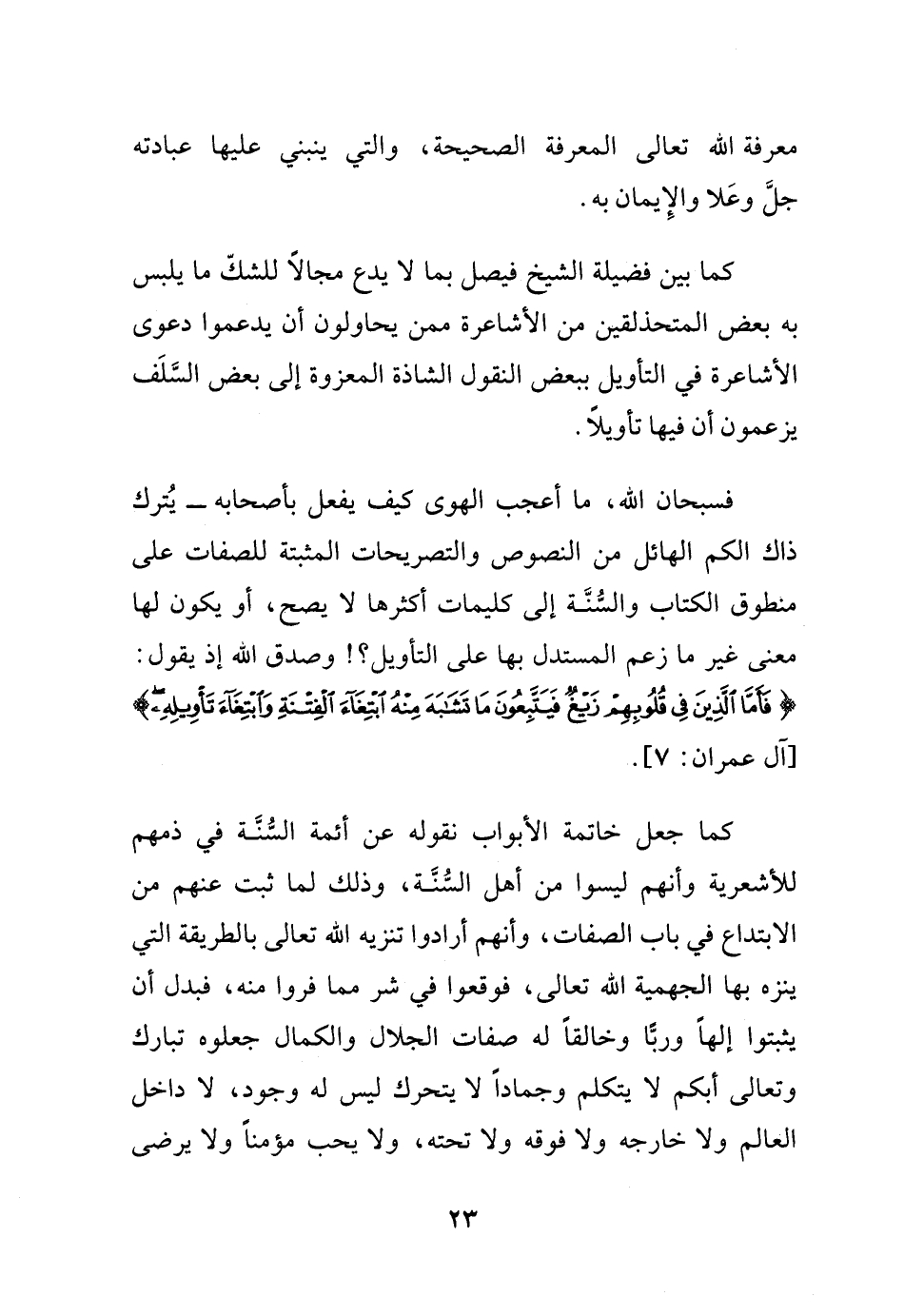 كما جعل خاتمة الأبواب نقوله عن أئمة السنة في ذمهم للأشعرية وأنهم ليسوا من أهل السنة، وذلك لما ثبت عنهم من الابتداع في باب الصفات، وأنهم أرادوا تنزيه الله تعالى بالطريقة التي ينزه بها الجهمية الله تعالى، فوقعوا في شر مما فروا منه، فبدل أن يثبتوا إلهاً ورباً وخالقاً له صفات الجلال والكمال جعلوه تبارك وتعالى أبكم لا يتكلم وجماداً لايتحرك ليس له وجود، لا داخل العالم ولا خارجه ولا فوقه ولا تحته، ولا يحب مؤمناً ولا يرضى