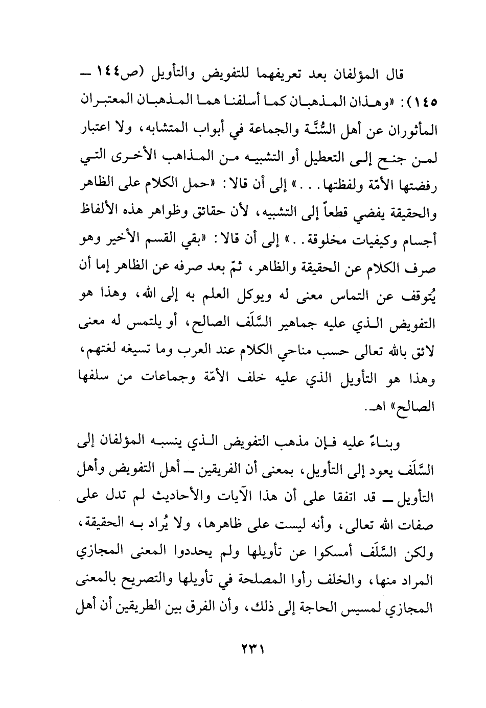 قال الأشعريان بعد تعريفهما للتفويض والتأويل (ص144 - 145): (وهذان المذهبان كما أسلفنا هما المذهبان المعتبران المأثوران عن أهل السنة والجماعة في أبواب المتشابه، ولا اعتبار لمن جنح إلى التعطيل أو التشبيه من المذاهب الأخرى التي رفضتها الأمة ولفظتها ... ) إلى أن قالا: (حمل الكلام على الظاهر والحقيقة يفضي قطعاً إلى التشبيه، لأن حقائق وظواهر هذه الألفاظ أجسام وكيفيات مخلوقة ... ) إلى أن قالا: (بقي القسم الأخير وهو صرف الكلام عن الحقيقة والظاهر، ثم بعد صرفه عن الظاهر إما أن يُتوقف عن التماس معنى له ويوكل العلم به إلى الله، وهذا هو التفويض الذي عليه جماهير السلف الصالح، أو يلتمس له معنى لائق بالله تعالى حسب مناحي الكلام عند العرب وما تسيغه لغتهم، وهذا هو التأويل الذي عليه خلف الأمة وجماعات من سلفها الصالح) اهـ.