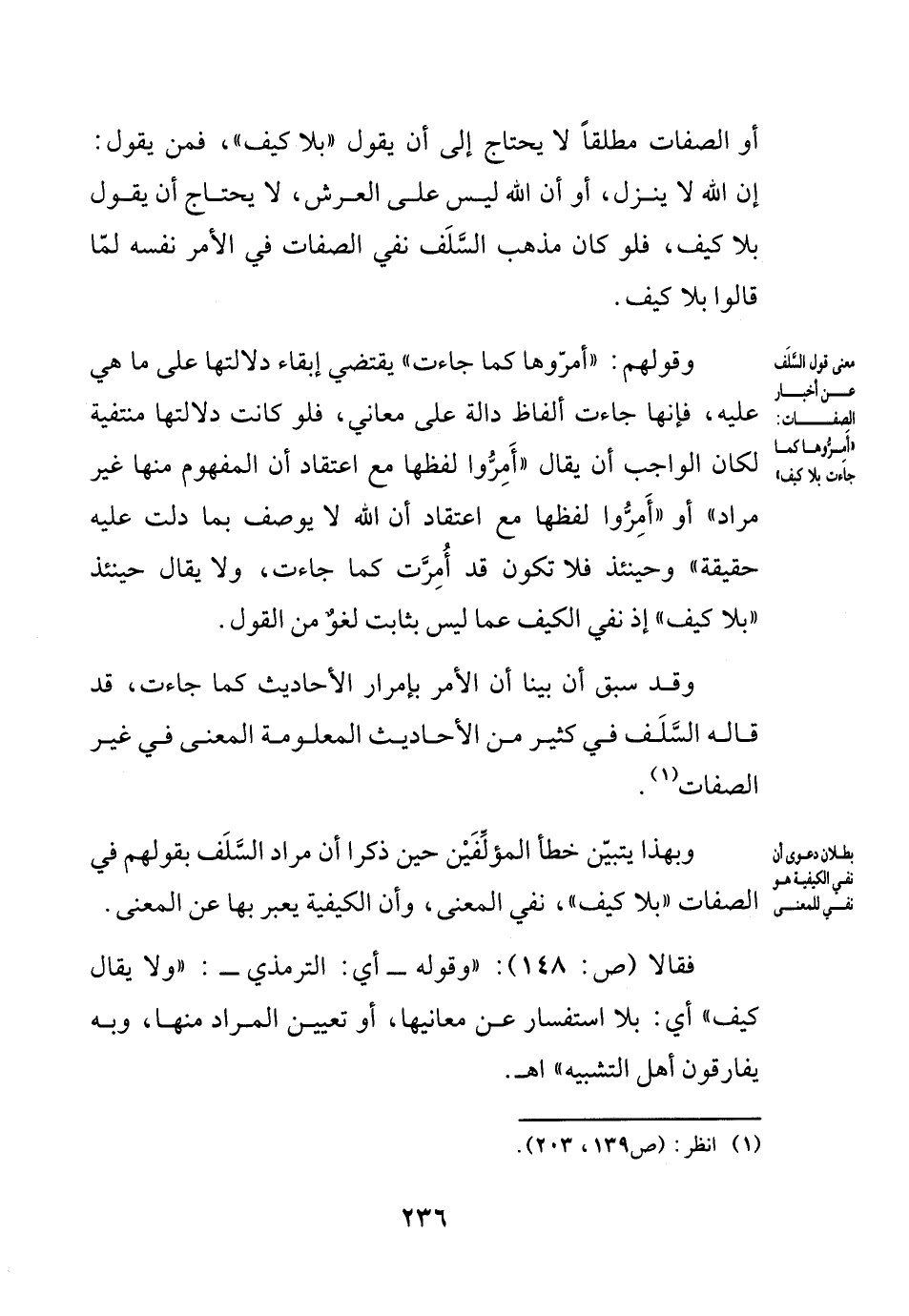 فقالا (ص148): (وقوله -أي الترمذي- "ولا يقال كيف" أي: بلا استفسار عن معانيها، أو تعيين المراد منها، وبه يفارقون أهل التشبيه) اهـ.