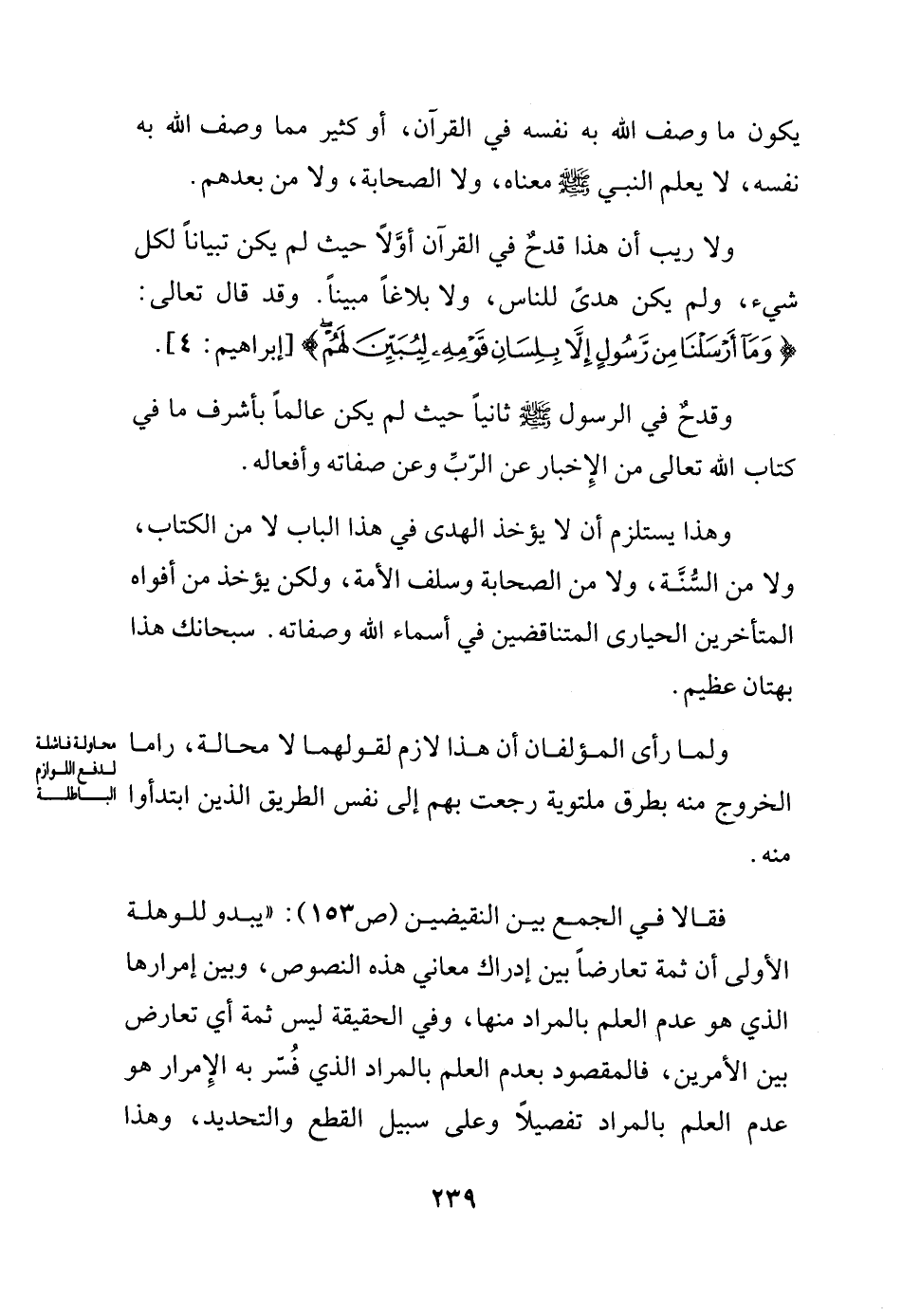 فقالا في الجمع بين النقيضين (ص153): (يبدو للوهلة الأولى أن ثمة تعارضاً بين إدراك معاني هذه النصوص، وبين إمرارها الذي هو عدم العلم بالمراد منها، وفي الحقيقة ليس ثمة أي تعارض بين الأمرين، فالمقصود بعدم العلم بالمراد الذي فُسّر به الإمرار هو عدم العلم بالمراد تفصيلاً وعلى سبيل القطع والتحديد، وهذا