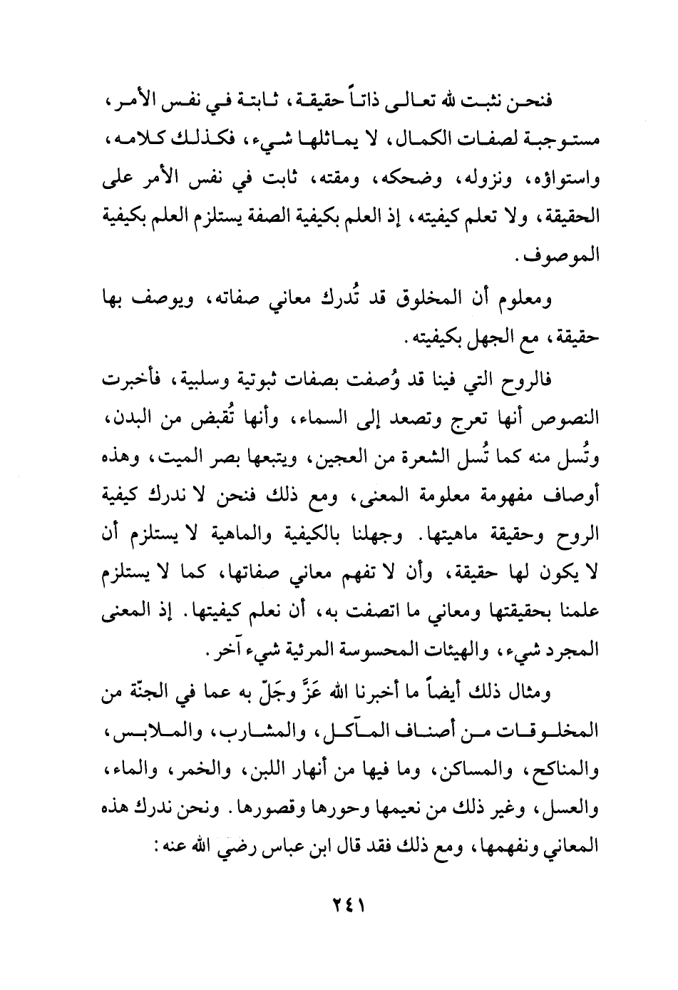 فالروح التي فينا قد وُصفت بصفات ثبوتية وسلبية، فأخبرت النصوص أنها تعرج وتصعد إلى السماء، وأنها تُقبض من البدن، وتُسل منه كما تُسل الشعرة من العجين، ويتبعها بصر الميت، وهذه أوصاف مفهومة معلومة المعنى، ومع ذلك فنحن لا ندرك كيفية الروح وحقيقة ماهيتها. وجهلنا بالكيفية والماهية لا يستلزم أن لا يكون لها حقيقة، وأن لا تفهم معاني صفاتها، كما لا يستلزم علمنا بحقيقتها ومعاني ما اتصفت به، أن نعلم كيفيتها. إذ المعنى المجرد شيء، والهيئات المحسوسة المرئية شيء آخر.