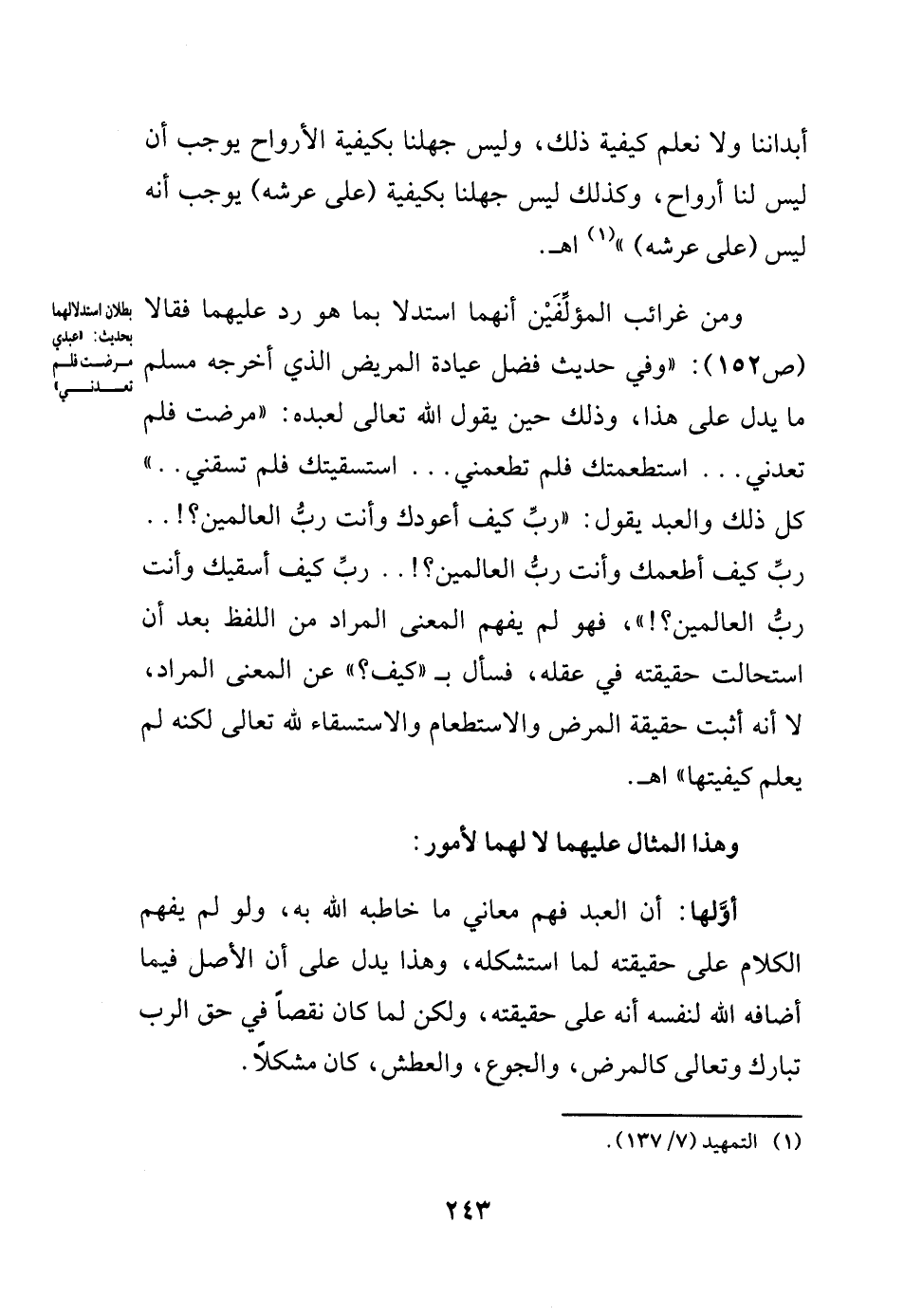 ومن غرائب الأشعريّيْن أنهما استدلا بما هو رد عليهما فقالا (ص152): (وفي حديث فضل عيادة المريض الذي أخرجه مسلم ما يدل على هذا، وذلك حين يقول الله تعالى لعبده: "مرضت فلم تعدني ... استطعمتك فلم تطعمني ... استسقيتك فلم تسقني ... " كل ذلك والعبد يقول: "رب كيف أعودك وأنت رب العالمين؟! .. رب كيف أطعمك وأنت رب العالمين؟! .. رب كيف أسقيك وأنت رب العالمين؟! " فهو لم يفهم المعنى المراد من اللفظ بعد أن استحالت حقيقته في عقله، فسأل بـ "كيف؟ " عن المعنى المراد، لا أنه أثبت حقيقة المرض والاستطعام والاستسقاء لله تعالى لكنه لم يعلم كيفيتها) اهـ.