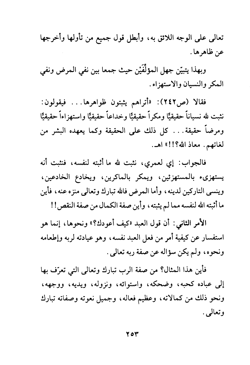 وبهذا يتبين جهل الأشعريين حيث جمعا بين نفي المرض ونفي المكر والنسيان والاستهزاء.