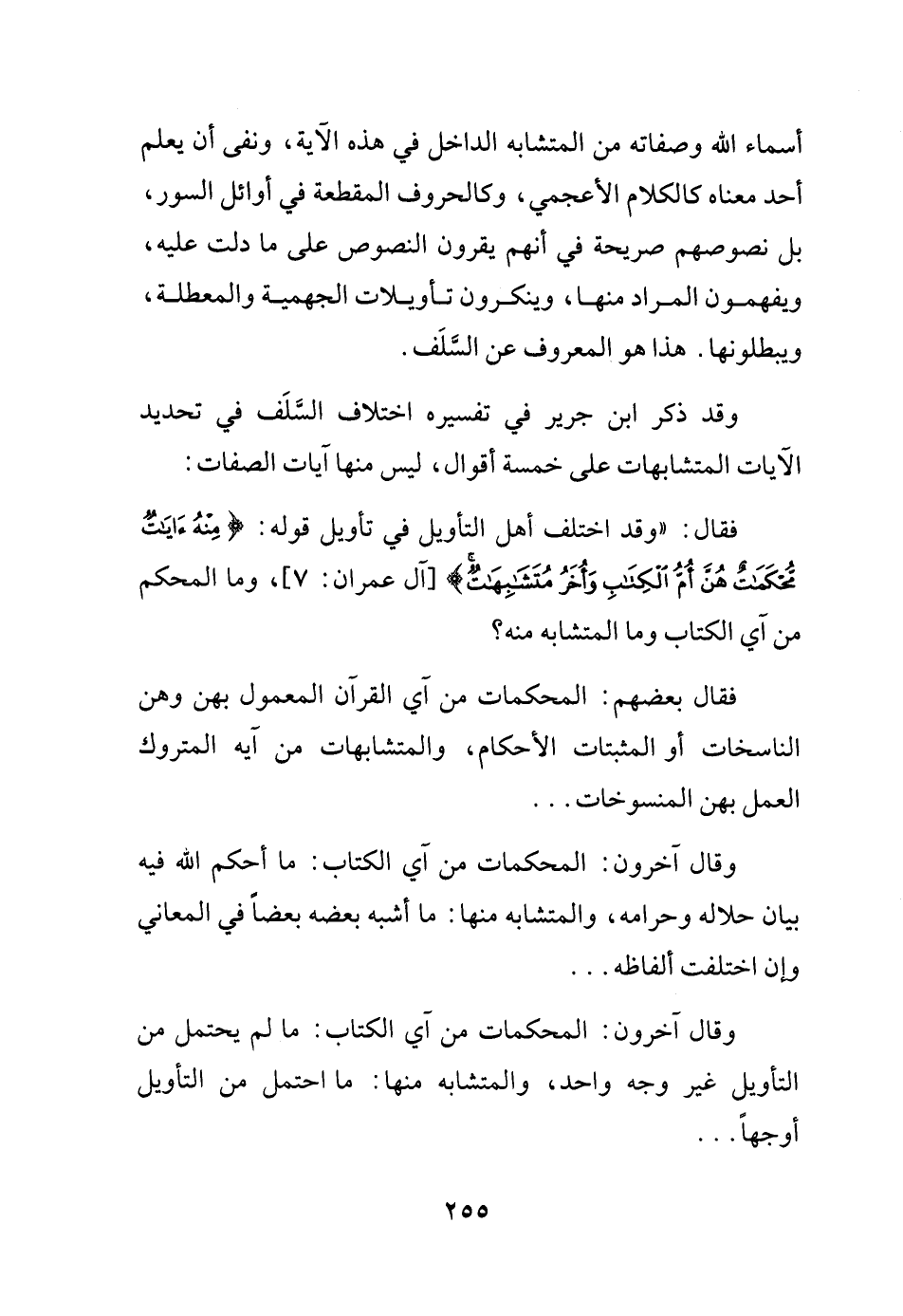 وقد ذكر ابن جرير في تفسيره اختلاف السلف في تحديد الآيات المتشابهات على خمسة أقوال، ليس منها آيات الصفات:
