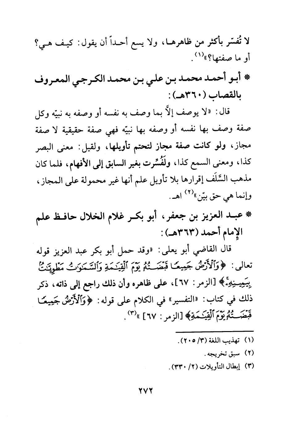 قال القاضي أبو يعلى: (وقد حمل أبو بكر عبد العزيز قوله تعالى {والأرض جميعاً قبضته يوم القيامة والسماوات مطويات بيمينه} الزمر67، على ظاهره وان ذلك راجع إلى ذاته، ذكر ذلك في كتاب "التفسير" في الكلام على قوله {والأرض جميعاً قبضته يوم القيامة} الزمر67 .. ) (¬2).