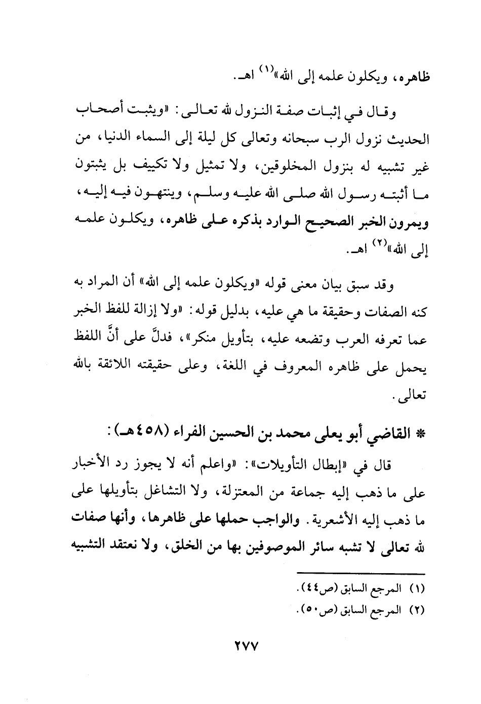وقال في إثبات صفة النزول لله تعالى: (ويثبت أصحاب الحديث نزول الرب سبحانه وتعالى كل ليلة إلى السماء الدنيا، من غير تشبيه له بنزول المخلوقين، ولا تمثيل ولا تكييف بل يثبتون ما أثبته رسول الله صلى الله عليه وسلم، وينتهون فيه إليه، ويمرون الخبر الصحيح الوارد بذكره على ظاهره، ويكلون علمه إلى الله) (¬2) اهـ.