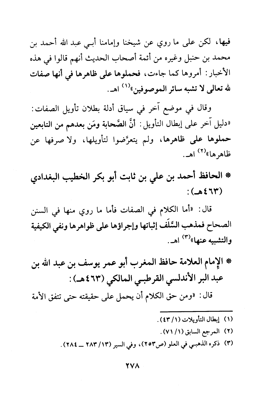 وقال في موضع آخر في سياق أدلة بطلان تأويل الصفات: (دليل آخر على إبطال التأويل: أن الصحابة ومن بعدهم من التابعين حملوها على ظاهرها، ولم يتعرضوا لتأويلها، ولا صرفها عن ظاهرها) (¬2) اهـ.