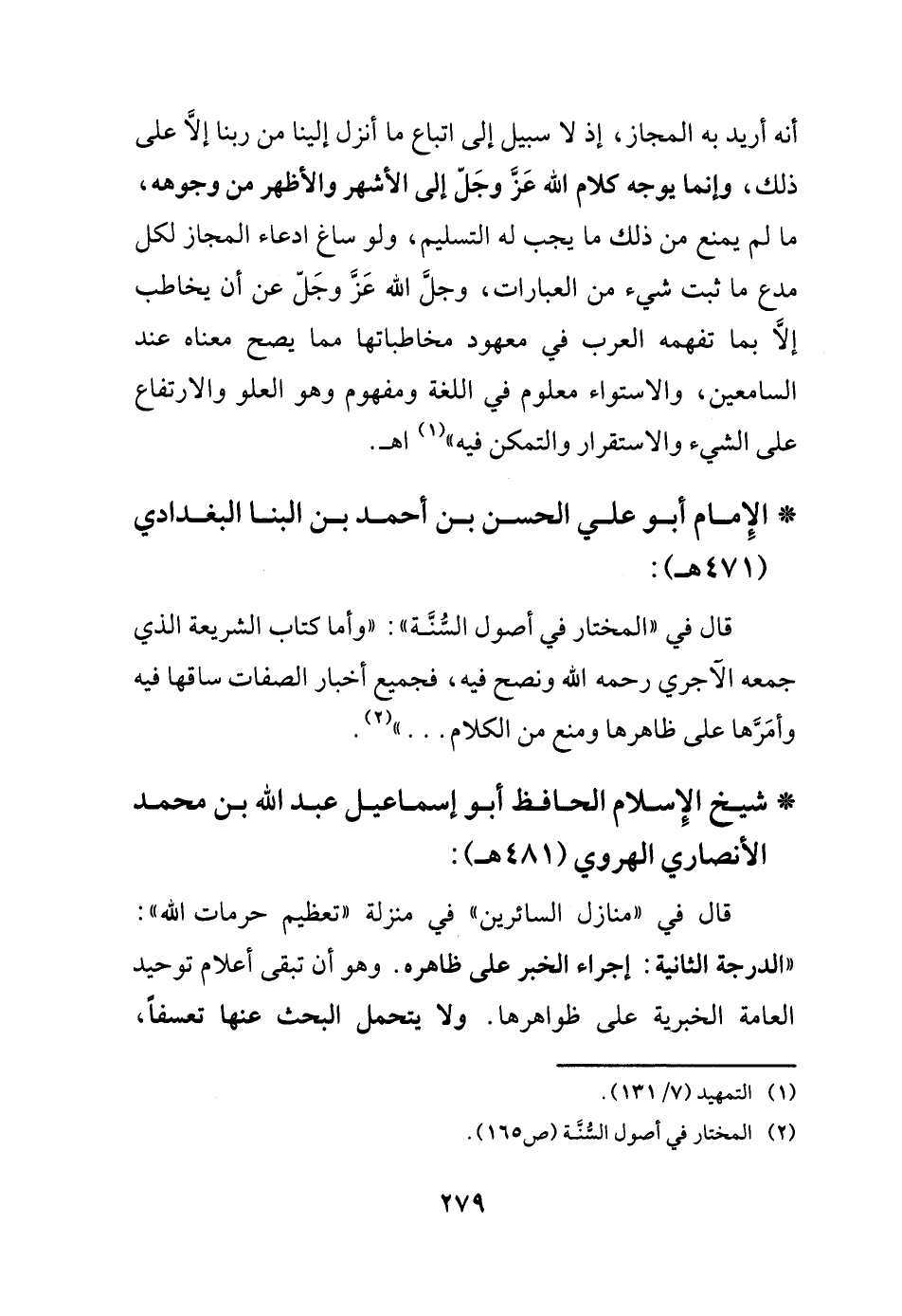 قال في "منازل السائرين" في منزلة "تعظيم حرمات الله": (الدرجة الثانية: إجراء الخبر على ظاهره. وهو أن تبقى أعلام توحيد العامة الخبرية على ظواهرها. ولا يتحمل البحث عنها تعسفاً،