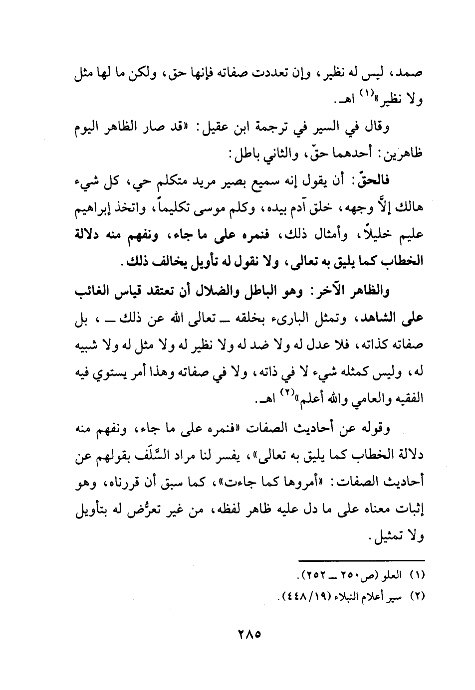 والظاهر الآخر: وهو الباطل والضلال أن تعتقد قياس الغائب على الشاهد، وتمثل البارئ بخلقه تعالى الله عن ذلك، بل صفاته كذاته، فلا عدل له ولا ضد له ولا نظير له ولا مثل له ولا شبيه له، وليس كمثله شيء لا في ذاته، ولا في صفاته وهذا أمر يستوي فيه الفقيه والعامي والله أعلم) (¬2) اهـ.