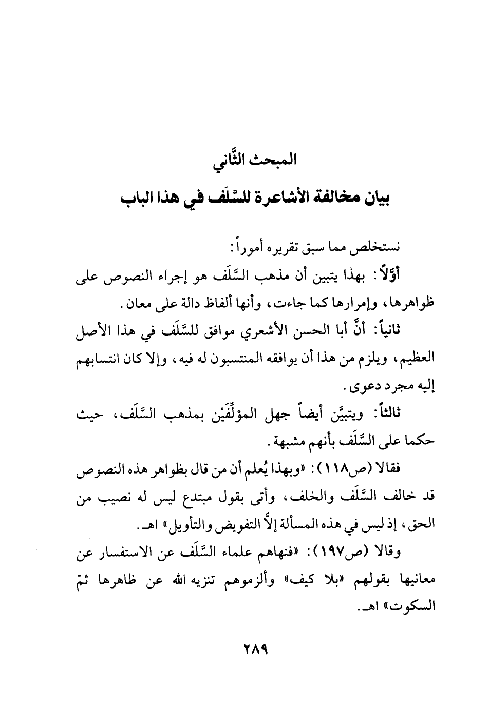 وقالا (ص197): (فنهاهم علماء السلف عن الاستفسار عن معانيها بقولهم "بلا كيف" وألزموهم تنزيه الله عن ظاهرها ثم السكوت) اهـ.