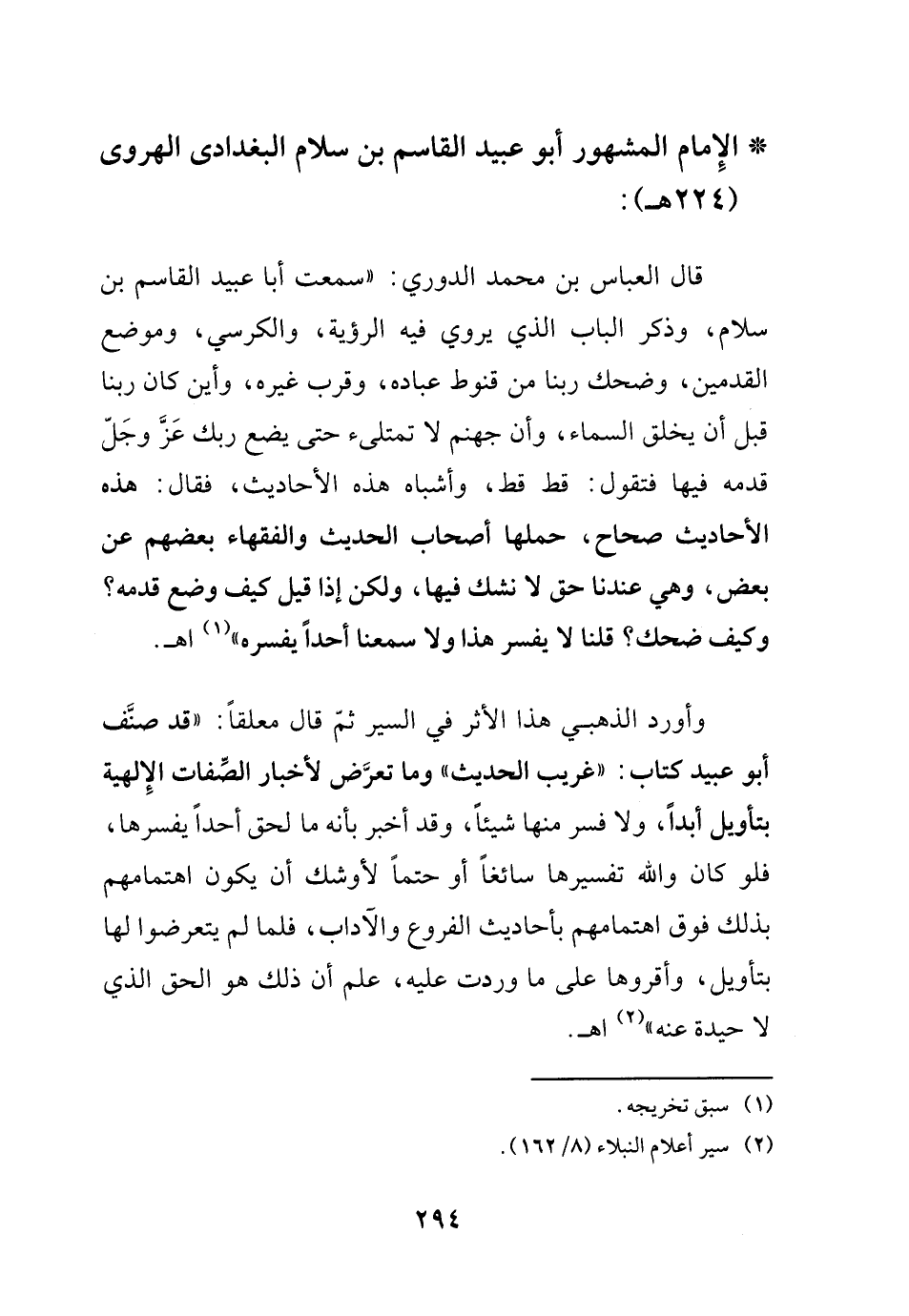 قال العباس بن محمد الدوري: (سمعت أبا عبيد القاسم بن سلام، وذكر الباب الذي يروي فيه الرؤية، والكرسي، وموضع القدمين، وضحك ربنا من قنوط عباده، وقرب غيره، وأين كان ربنا قبل أن يخلق السماء، وأن جهنم لا تمتلئ حتى يضع ربك عز وجل قدمه فيها فتقول: قط قط، وأشباه هذه الأحاديث، فقال: هذه الأحاديث صحاح، حملها أصحاب الحديث والفقهاء بعضهم عن بعض، وهي عندنا حق لا نشك فيها، ولكن إذا قيل كيف وضع قدمه؟ وكيف ضحك؟ قلنا لا يفسر هذا ولا سمعنا أحداً يفسره) (¬1) اهـ.