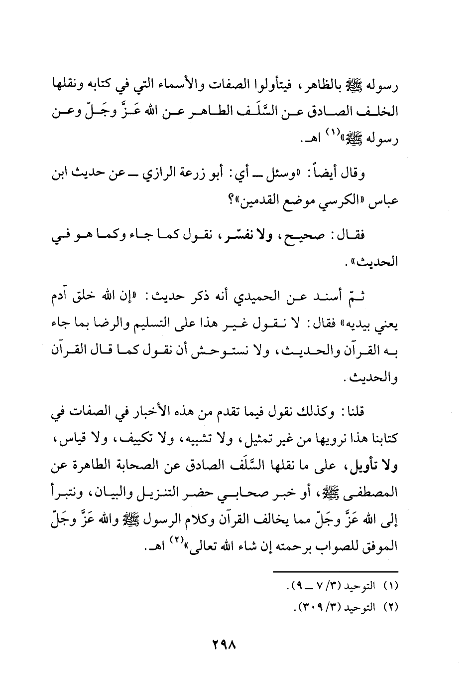 قلنا: وكذلك نقول فيما تقدم من هذه الأخبار في الصفات في كتابنا هذا نرويها من غير تمثيل، ولا تشبيه، ولا تكييف، ولا قياس، ولا تأويل، على ما نقلها السلف الصادق عن الصحابة الطاهرة عن المصطفى - صلى الله عليه وسلم -، أو خبر صحابي حضر التنزيل والبيان، ونتبرأ إلى الله عز وجل مما يخالف القرآن وكلام الرسول - صلى الله عليه وسلم - والله عز وجل الموفق للصواب برحمته إن شاء الله تعالى) (¬2) اهـ.