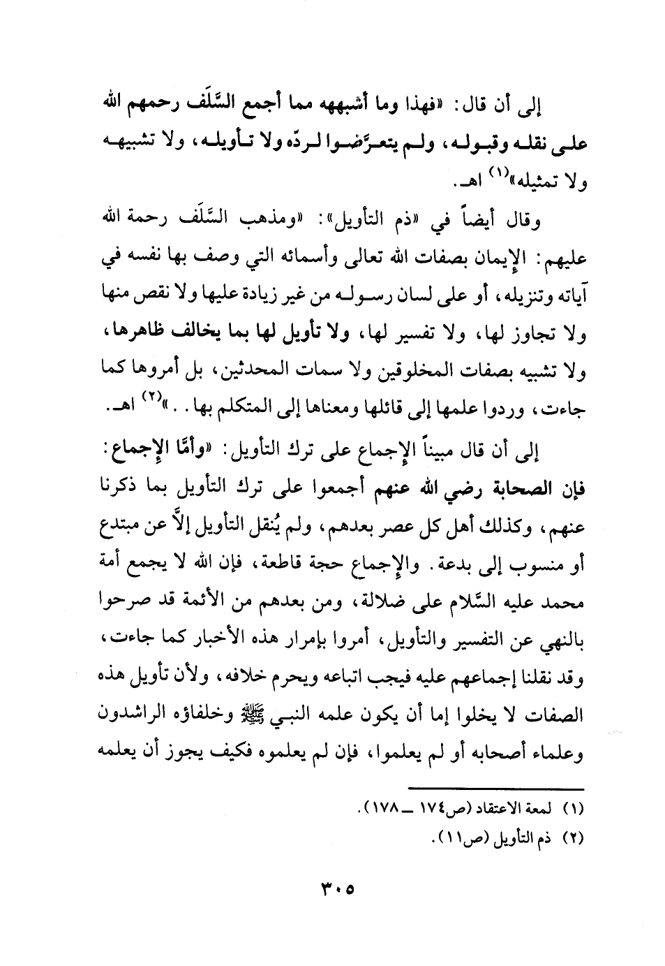 إلى أن قال مبيناً الإجماع على ترك التأويل: (وأما الإجماع: فإن الصحابة رضي الله عنهم أجمعوا على ترك التأويل بما ذكرنا عنهم، وكذلك أهل كل عصر بعدهم، ولم يُنقل التأويل إلا عن مبتدع أو منسوب إلى بدعة. والإجماع حجة قاطعة، فإن الله لا يجمع أمة محمد عليه السلام على ضلالة، ومن بعدهم من الأئمة قد صرحوا بالنهي عن التفسير والتأويل، أمروا بإمرار هذه الأخبار كما جاءت، وقد نقلنا إجماعهم عليه فيجب اتباعه ويحرم خلافه، ولأن تأويل هذه الصفات لا يخلوا إما أن يكون علمه النبي - صلى الله عليه وسلم - وخلفاؤه الراشدون وعلماء أصحابه أو لم يعلموا، فإن لم يعلموه فكيف يجوز أن يعلمه