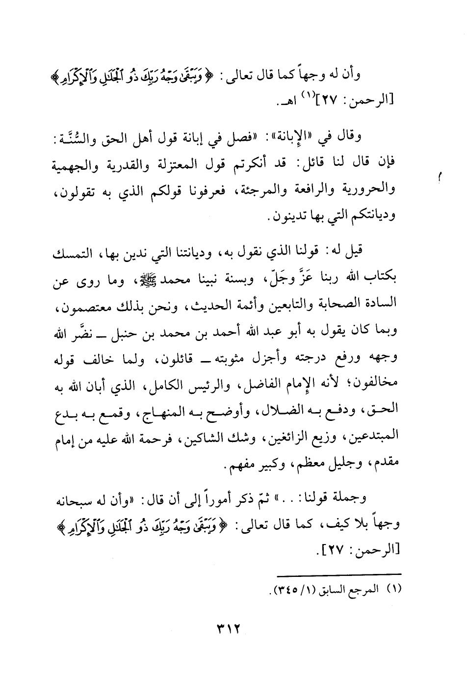 وجملة قولنا: ... ) ثم ذكر أموراً إلى أن قال: (وأن له سبحانه وجهاً بلا كيف، كما قال: {ويبقى وجه ربك ذو الجلال والإكرام} الرحمن27.