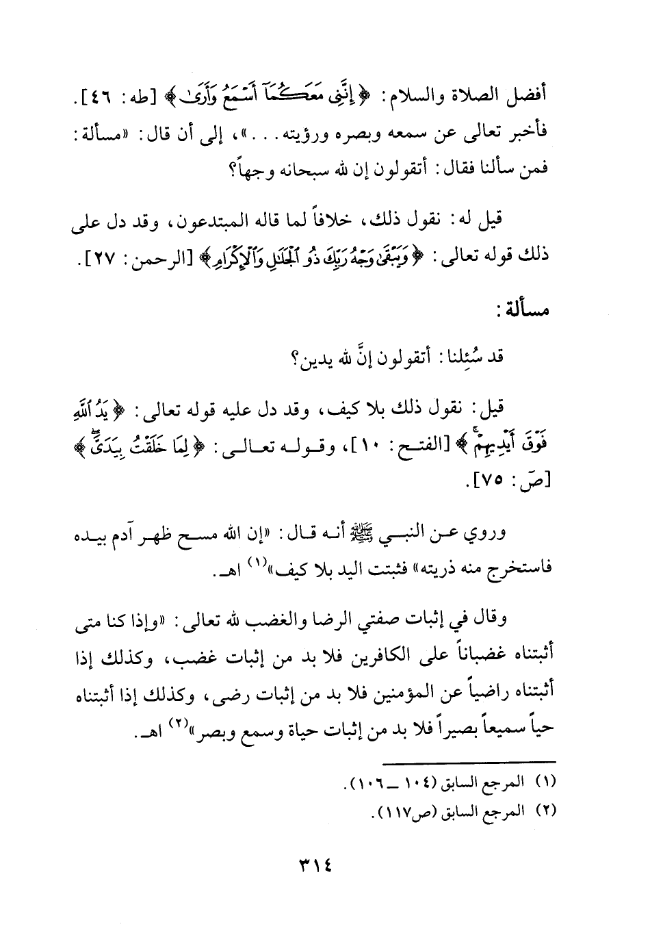أفضل الصلاة والسلام: {إنني معكما أسمع وأرى} طه46. فأخبر تعالى عن سمعه وبصره ورؤيته ... ) إلى أن قال: (مسألة: فمن سألنا فقال: أتقولون إن لله سبحانه وجهاً؟