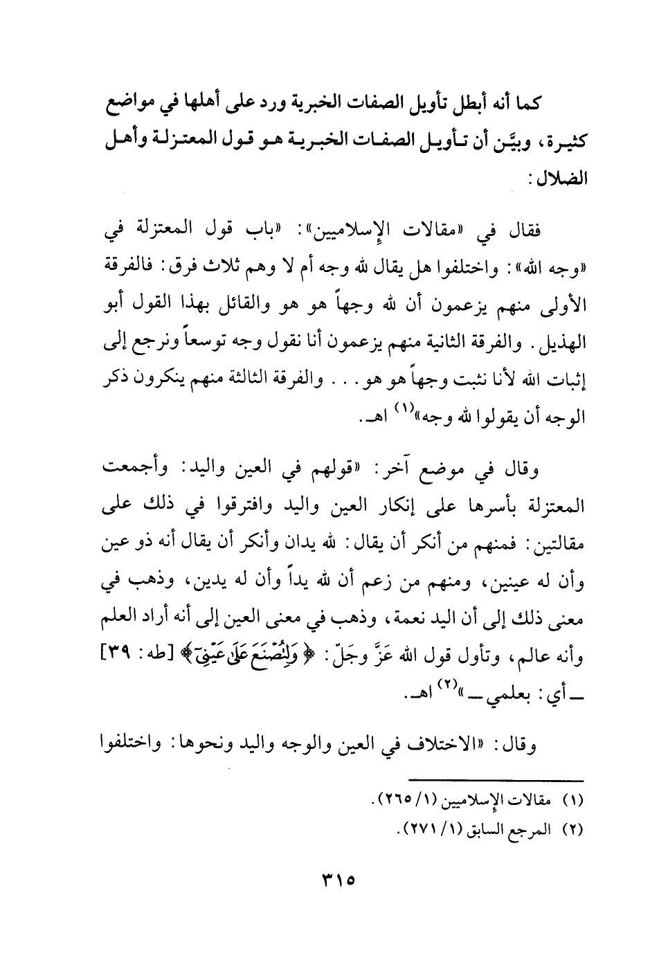وقال في موضع آخر: (قولهم في العين واليد: وأجمعت المعتزلة بأسرها على إنكار العين واليد وافترقوا في ذلك على مقالتين: فمنهم من أنكر أن يقال: لله يدان وأنكر أن يقال أنه ذو عين وأن له عينين، ومنهم من زعم أن لله يداً وأن له يدين، وذهب في معنى ذلك إلى أن اليد نعمة، وذهب في معنى العين إلى أنه أراد العلم وأنه عالم، وتأول قول الله عز وجل: {ولتصنع على عيني} طه39، أي بعلمي.) (¬2) اهـ.