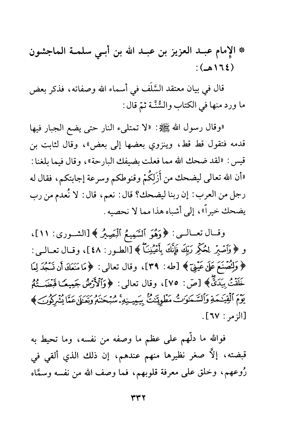 قال في بيان معتقد السلف في أسماء الله وصفاته، فذكر بعض ما ورد منها في الكتاب والسنة ثم قال: (وقال رسول الله - صلى الله عليه وسلم -: "لا تمتلىء النار حتى يضع الجبار فيها قدمه فتقول قط قط، وينزوي بعضها إلى بعض"، وقال لثابت بن قيس: "لقد ضحك الله مما فعلت بضيفك البارحة"، وقال فيما بلغنا: "أن الله تعالى ليضحك من أزلكم وقنوطكم وسرعة إجابتكم، فقال له رجل من العرب: إن ربنا ليضحك؟ قال: نعم. قال: لا نعدم من رب يضحك خيراً"، إلى أشباه هذا مما لا نحصيه، وقال تعالى: {وهو السميع البصير} الشورى11، و {اصبر لحكم ربك فإنك بأعيننا} الطور48، وقال تعالى: {ولتصنع على عيني} طه39، وقال تعالى: {ما منعك أن تسجد لما خلقت بيدي} ص75، وقال تعالى: {والأرض جميعا قبضته يوم القيامة والسموات مطويات بيمينه سبحانه وتعالى عما يشركون} الزمر67، فوالله ما دلهم على عظم ما وصفه من نفسه، وما تحيط به قبضته، إلا صغر نظيرها منهم عندهم، إن ذلك الذي ألقي في روعهم، وخلق على معرفة قلوبهم، فما وصف الله من نفسه وسماه