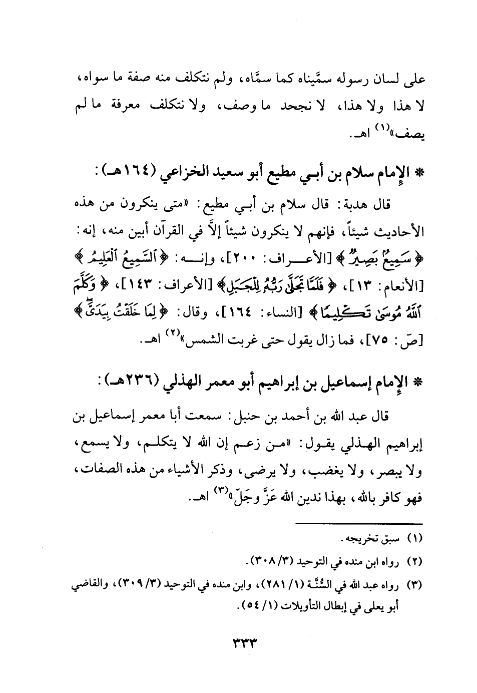 قال هدبة: قال سلام بن أبي مطيع: (متى ينكرون من هذه الأحاديث شيئاً، فإنهم لا ينكرون شيئاً إلا في القرآن أبين منه، إنه {سميع بصير} الأعراف200، وإنه {السميع العليم} الأنعام13، {فلما تجلى ربه للجبل} الأعراف143، {وكلم الله موسى تكليما} النساء164،، وقال {لما خلقت بيدي} ص75،، فما زال يقول حتى غربت الشمس) (¬2) اهـ.