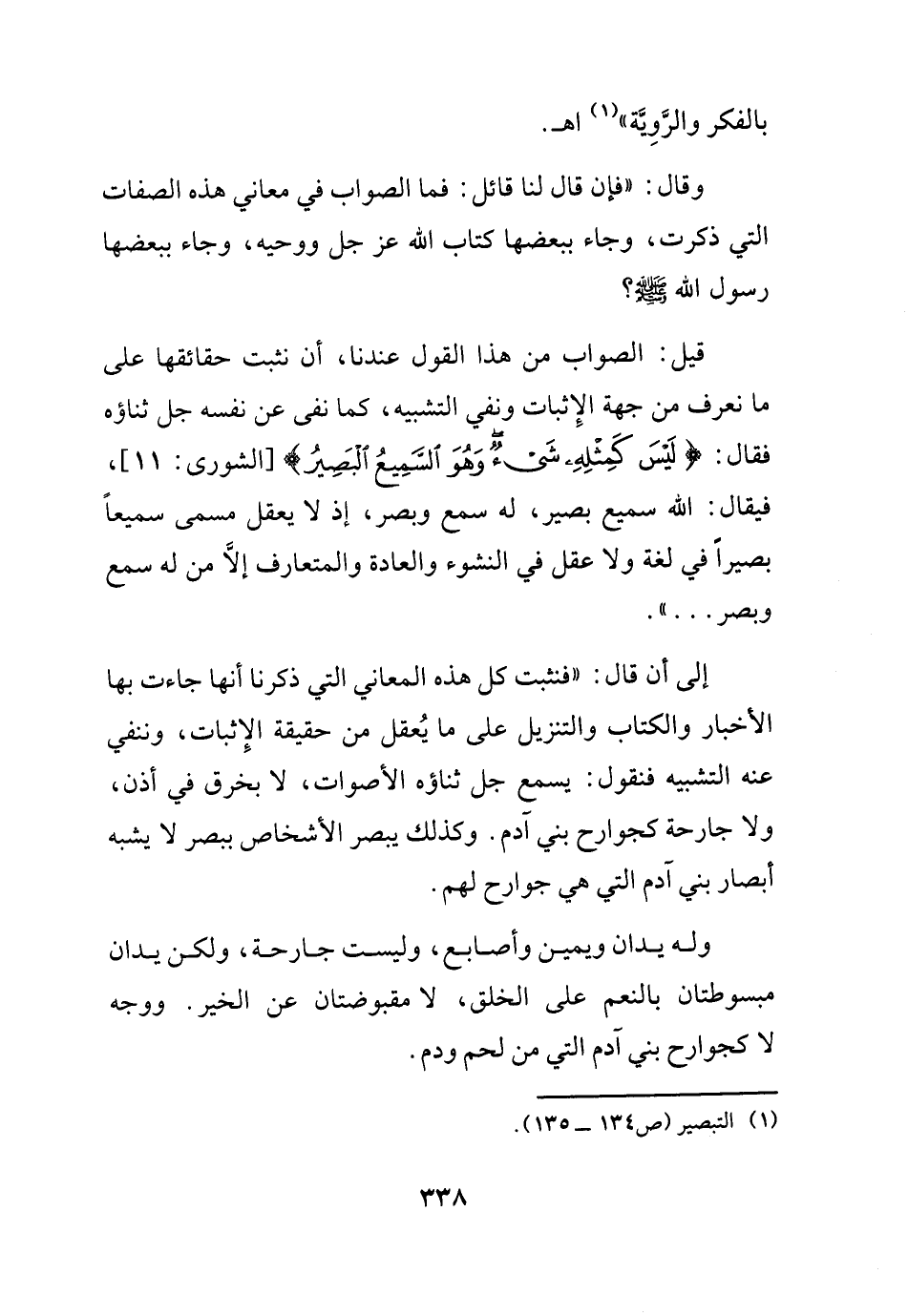 وقال: (فإن قال لنا قائل: فما الصواب في معاني هذه الصفات التي ذكرت، وجاء ببعضها كتاب الله عز جل ووحيه، وجاء ببعضها رسول الله - صلى الله عليه وسلم -. قيل: الصواب من هذا القول عندنا، أن نثبت حقائقها على ما نعرف من جهة الإثبات ونفي التشبيه، كما نفى عن نفسه جل ثناؤه فقال: {ليس كمثله شيء وهو السميع البصير} الشورى11،. فيقال: الله سميع بصير، له سمع وبصر، إذ لا يعقل مسمى سميعاً بصيراً في لغة ولا عقل في النشوء والعادة والمتعارف إلا من له سمع وبصر.) إلى أن قال: (فنثبت كل هذه المعاني التي ذكرنا أنها جاءت بها الأخبار والكتاب والتنزيل على ما يُعقل من حقيقة الإثبات، وننفي عنه التشبيه فنقول: يسمع جل ثناؤه الأصوات، لا بخرق في أذن، ولا جارحة كجوارح بني آدم. وكذلك يبصر الأشخاص ببصر لا يشبه أبصار بني آدم التي هي جوارح لهم.
