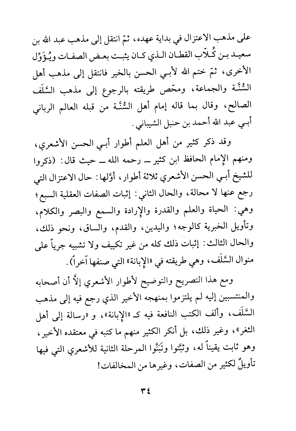على مذهب الاعتزال في بداية عهده، ثم انتقل إلى مذهب عبد الله بن سعيد بن كلاب القطان الذي كان يثبت بعض الصفات ويؤول الآخ، ثم ختم الله لأبي الحسن بالخير فانتقل إلى مذهب أهل السنة والجماعة، ومحّص طريقته بالرجوع إلى مذهب السلف الصالح، وقال بما قاله إمام أهل السنة من قبله العالم الرباني أبي عبد الله أحمد بن حنبل الشيباني، وقد ذكر كثير من أهل العلم أطوار أبي الحسن الأشعري، ومنهم الإمام الحافظ ابن كثير -رحمه الله- حيث قال: (ذكروا للشيخ أبي الحسن الأشعري ثلاثة أطوار: أولها: حال الاعتزال التي رجع عنها لا محالة، والحال الثاني: إثبات الصفات العقلية السبع وهي: الحياة والعلم والقدرة والإرادة والسمع والبصر والكلام، وتأويل الخبرية كالوجه، واليدين، والقدم، والساق، ونحو ذلك، والحال الثالث: إثبات ذلك كله من غير تكييف ولا تشبيه جرياً على منوال السلف، وهي طريقته في الإبانة التي صنفها آخراً).