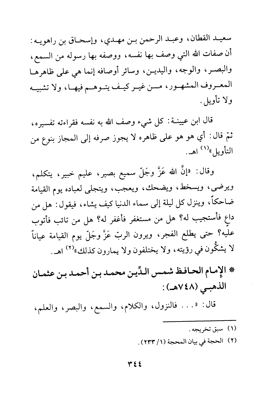 سعيد القطان، وعبد الرحمن بن مهدي، وإسحاق بن راهويه: أن صفات الله التي وصف بها نفسه، ووصفه بها رسوله من السمع، والبصر، والوجه، واليدين، وسائر أوصافه إنما هي على ظاهرها المعروف المشهور، من غير كيف يتوهم فيها، ولا تشبيه ولا تأويل، قال ابن عيينة: كل شيء وصف الله به نفسه فقراءته تفسيره) ثم قال: (أي هو هو على ظاهره لا يجوز صرفه إلى المجاز بنوع من التأويل) (¬1) اهـ.