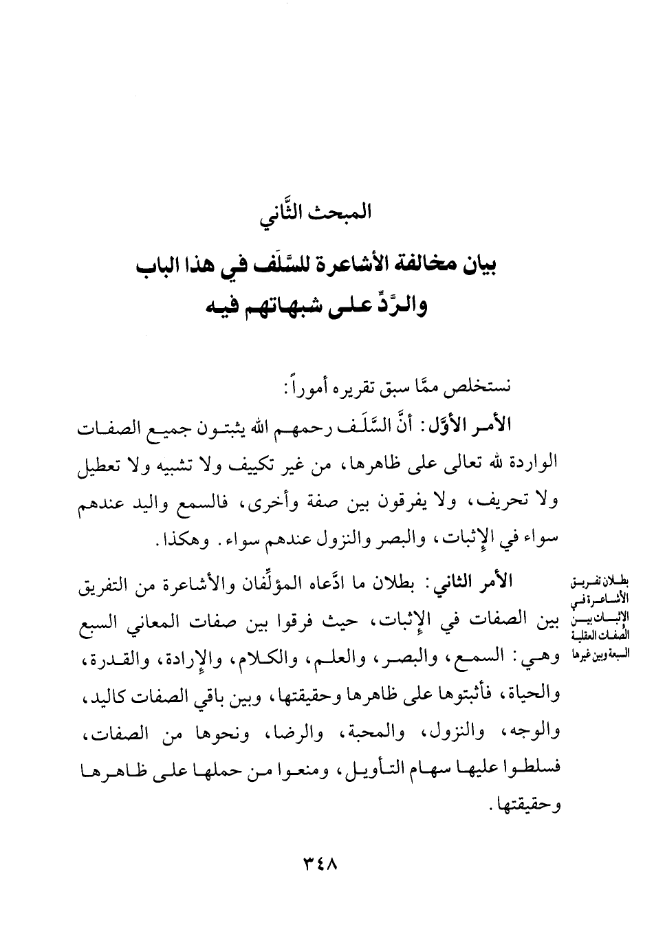 الأمر الثاني: بطلان ما ادعاه الأشعريان والأشاعرة من التفريق بين الصفات في الإثبات، حيث فرقوا بين صفات المعاني السبع وهي: السمع، والبصر، والعلم، والكلام، والإرادة، والقدرة، والحياة، فأثبتوها على ظاهرها وحقيقتها، وبين باقي الصفات كاليد، والوجه، والنزول، والمحبة، والرضا، ونحوها من الصفات، فسلطوا عليها سهام التأويل، ومنعوا من حملها على ظاهرها وحقيقتها.