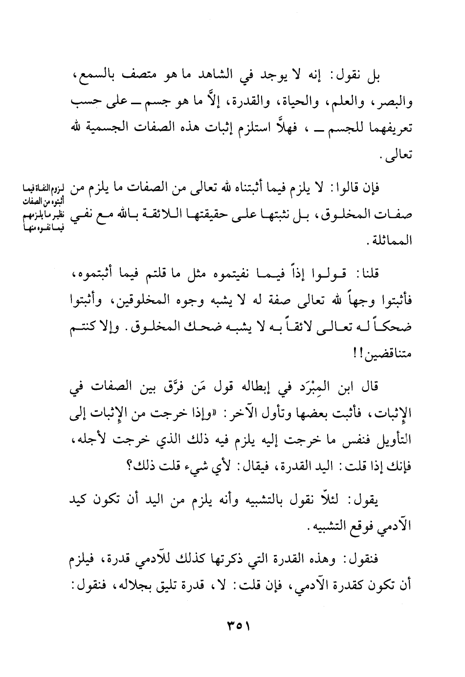 فإن قالوا: لا يلزم فيما أثبتناه لله تعالى من الصفات ما يلزم من صفات المخلوق، بل نثبتها على حقيقتها اللائقة بالله مع نفي المماثلة.