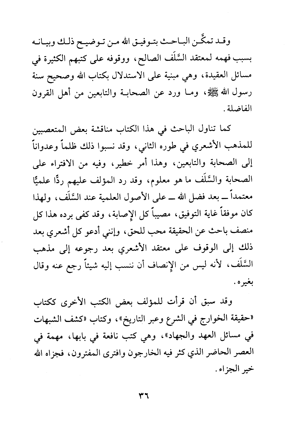 وقد تمكن الباحث بتوفيق الله من توضيح ذلك وبيانه بسبب فهمه لمعتقد السلف الصالح، ووقوفه على كتبهم الكثيرة في مسائل العقيدة، وهي مبنية على الاستدلال بكتاب الله وصحيح سنة رسول الله - صلى الله عليه وسلم -، وما ورد عن الصحابة والتابعين من أهل القرون الفاضلة، كما تناول الباحث في هذا الكتاب مناقشة بعض المتعصبين للمذهب الأشعري في طوره الثاني، وقد نسبوا ذلك ظلماً وعدواناً إلى الصحابة والتابعين، وهذا أمر خطير، وفيه من الافتراء على الصحابة والسلف ما هو معلوم، وقد رد المؤلف عليهم رداً علمياً معتمداً -بعد فضل الله- على الأصول العلمية عند السلف، ولهذا كان موفقاًَ غاية التوفيق، مصيباً كل الإصابة، وقد كفى برده هذا كل منصف باحث عن الحقيقة محب للحق، وإنني أدعو كل أشعري بعد ذلك إلى الوقوف على معتقد الأشعري بعد رجوعه إلى مذهب السلف، لأنه ليس من الإنصاف أن ننسب إليه شيئاً رجع عنه وقال بغيره.
