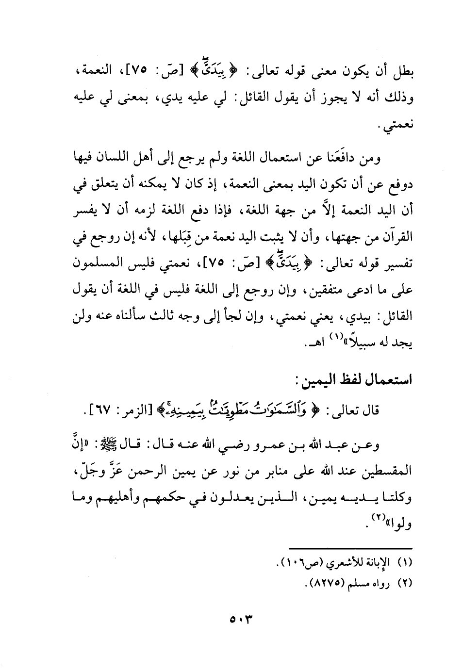 بطل أن يكون معنى قوله تعالى: {بيدي} ص75، النعمة، وذلك أنه لا يجوز أن يقول القائل: لي عليه يدي، بمعنى لي عليه نعمتي، ومن دافَعَنا عن استعمال اللغة ولم يرجع إلى أهل اللسان فيها دوفع عن أن تكون اليد بمعنى النعمة، إذ كان لا يمكنه أن يتعلق في أن اليد النعمة إلا من جهة اللغة، فإذا دفع اللغة لزمه أن لا يفسر القرآن من جهتها، وأن لا يثبت اليد نعمة من قِبَلها، لأنه إن روجع في تفسير قوله تعالى: {بيدي} ص75، نعمتي فليس المسلمون على ما ادعى متفقين، وإن روجع إلى اللغة فليس في اللغة أن يقول القائل: بيدي، يعني نعمتي، وإن لجأ إلى وجه ثالث سألناه عنه ولن يجد له سبيلا) (¬1) اهـ.