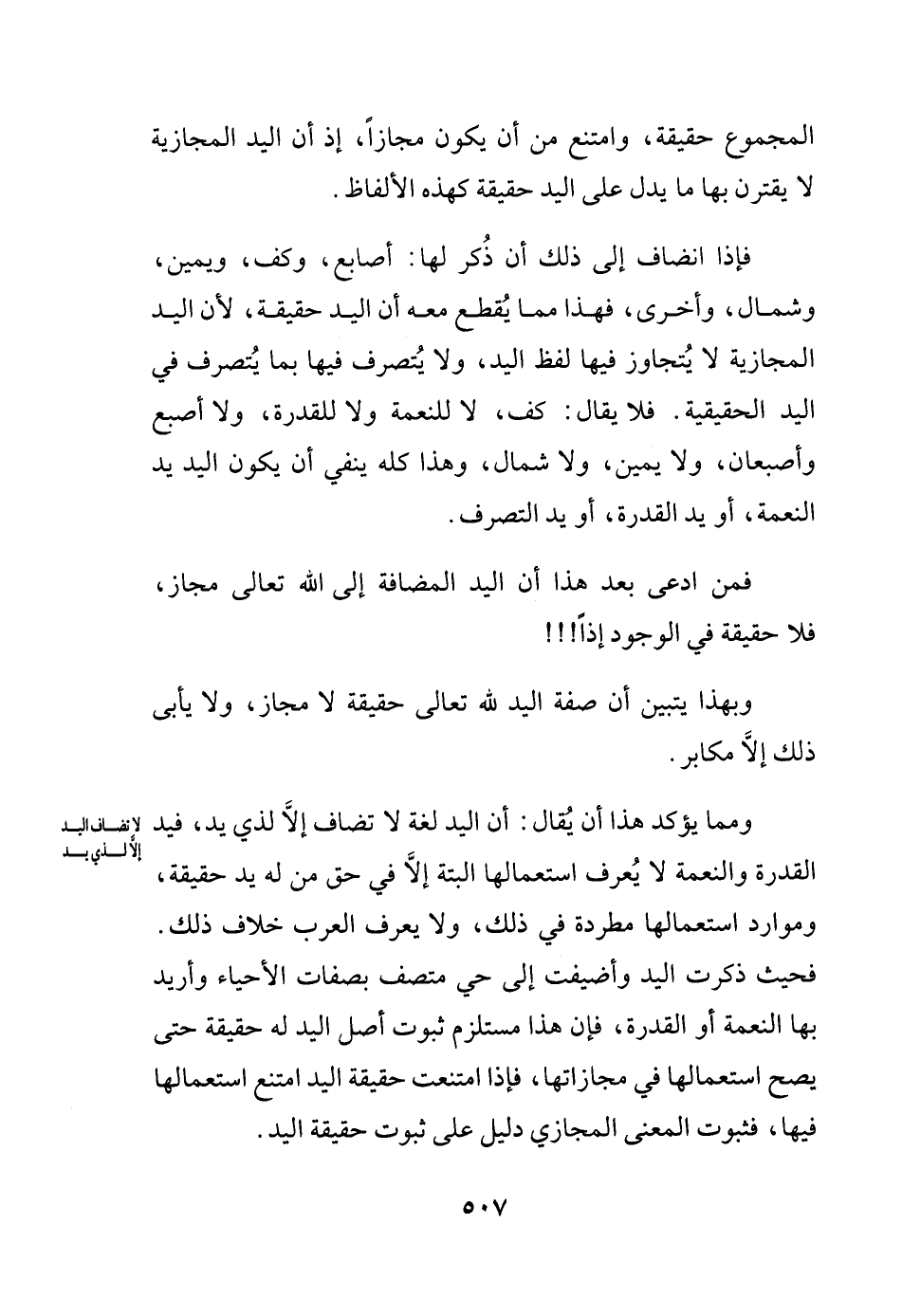 المجموع حقيقة، وامتنع من أن يكون مجازاً، إذ أن اليد المجازية لا يقترن بها ما يدل على اليد حقيقة كهذه الألفاظ. فإذا انضاف إلى ذلك أن ذُكر لها: أصابع، وكف، ويمين، وشمال، وأخرى، فهذا مما يُقطع معه أن اليد حقيقة، لأن اليد المجازية لا يُتجاوز فيها لفظ اليد، ولا يُتصرف فيها بما يُتصرف في اليد الحقيقية. فلا يقال: كف، لا للنعمة ولا للقدرة، ولا أصبع وأصبعان، ولا يمين، ولا شمال، وهذا كله ينفي أن يكون اليد يد النعمة، أو يد القدرة، أو يد التصرف.