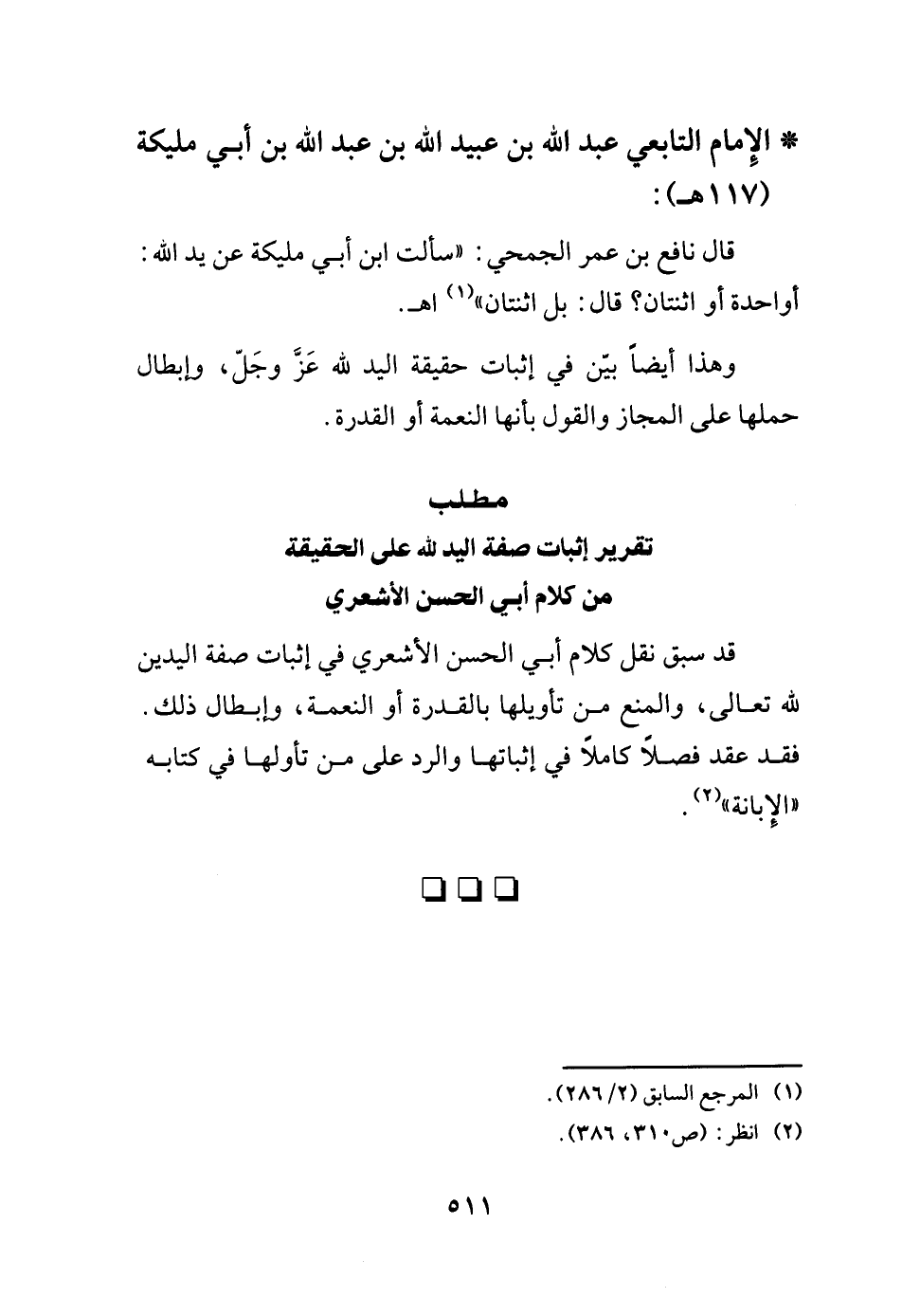 قال نافع بن عمر الجمحي: (سألت ابن أبي مليكة عن يد الله: أواحدة أو اثنتان؟ قال: بل اثنتان.) (¬2) اهـ.