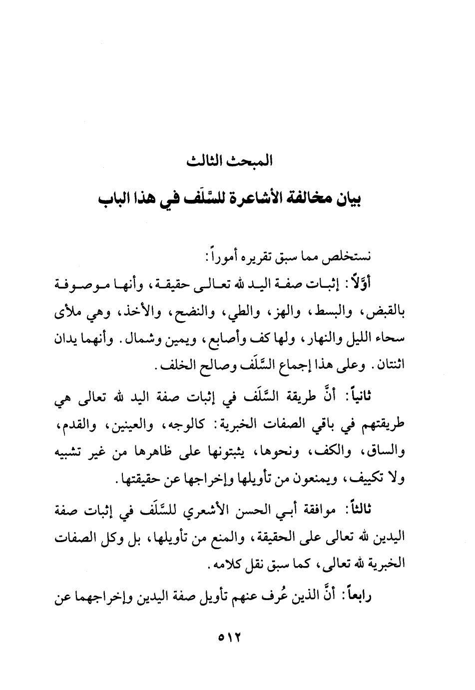 أولاً: إثبات صفة اليد لله تعالى حقيقة، وأنها موصوفة بالقبض، والبسط، والهز، والطي، والنضح، والأخذ، وهي ملئى سحاء الليل والنهار، ولها كف وأصابع، ويمين وشمال. وأنهما يدان اثنتان. وعلى هذا إجماع السلف وصالح الخلف.