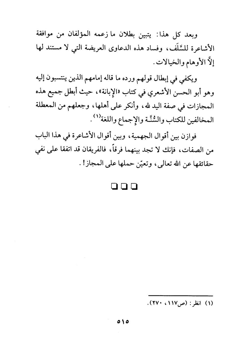 فوازن بين أقوال الجهمية، وبين أقوال الأشاعرة في هذا الباب من الصفات، فإنك لا تجد بينهما فرقاً، فالفريقان قد اتفقا على نفي حقائقها عن الله تعالى، وتعيّن حملها على المجاز!. فلا أدري أيهما أحق بانتساب الأشاعرة إليهم: السلف أم الجهمية!!
