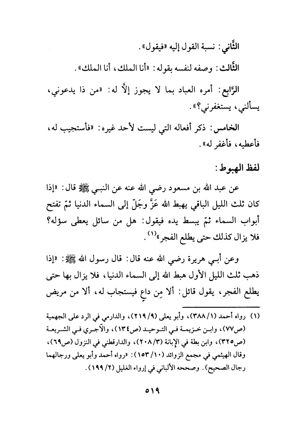 (¬1) رواه أحمد (1/ 388) وأبو يعلى (9/ 219) والدارمي في الرد على الجهمية (ص77) وابن خزيمة في التوحيد (ص134) والآجري في الشريعة (ص325) وابن بطة في الإبانة (3/ 208) والدارقطني في النزول (ص69) وقال الهيثمي في مجمع الزوائد (10/ 153): (رواه أحمد وأبو يعلى ورجالهما رجال الصحيح). وصححه الألباني في إرواء الغليل (2/ 199)