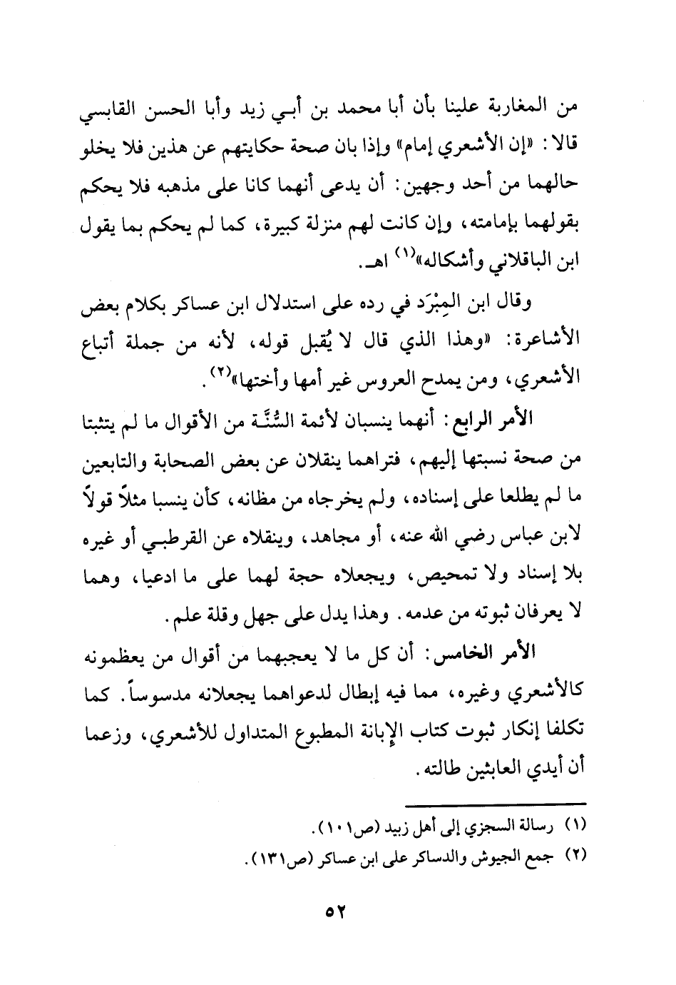 من المغاربة علينا بأن أبا محمد بن أبي زيد وأبا الحسن القابسي قالا: "إن الأشعري إمام" وإذا بان صحة حكايتهم عن هذين فلا يخلو حالهما من أحد وجهين: أن يدعى أنهما كانا على مذهبه فلا يحكم بقولهما بإمامته، وإن كانت لهم منزلة كبيرة، كما لم يحكم بما يقول ابن الباقلاني وأشكاله) (¬1) اهـ.