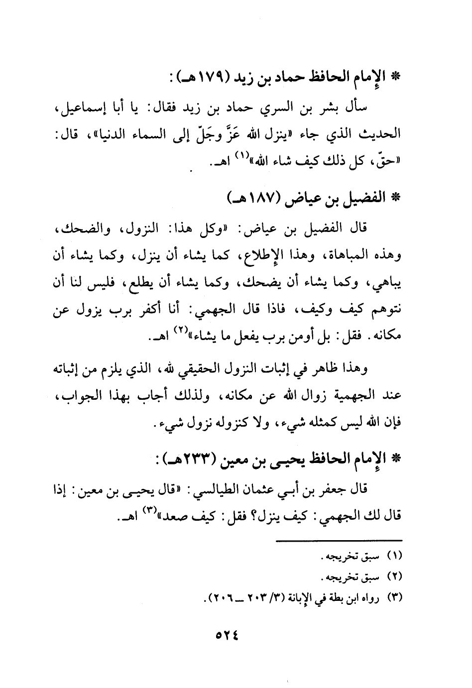 قال جعفر بن أبي عثمان الطيالسي: (قال يحيى بن معين: إذا قال لك الجهمي: كيف ينزل؟ فقل: كيف صعد) (¬3) اهـ.