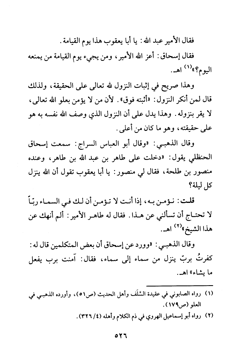 وقال الذهبي: (وقال أبو العباس السراج سمعت إسحاق الحنظلي يقول: (دخلت على طاهر بن عبد الله بن طاهر، وعنده منصور بن طلحة، فقال لي منصور يا أبا يعقوب تقول أن الله ينزل كل ليله؟.