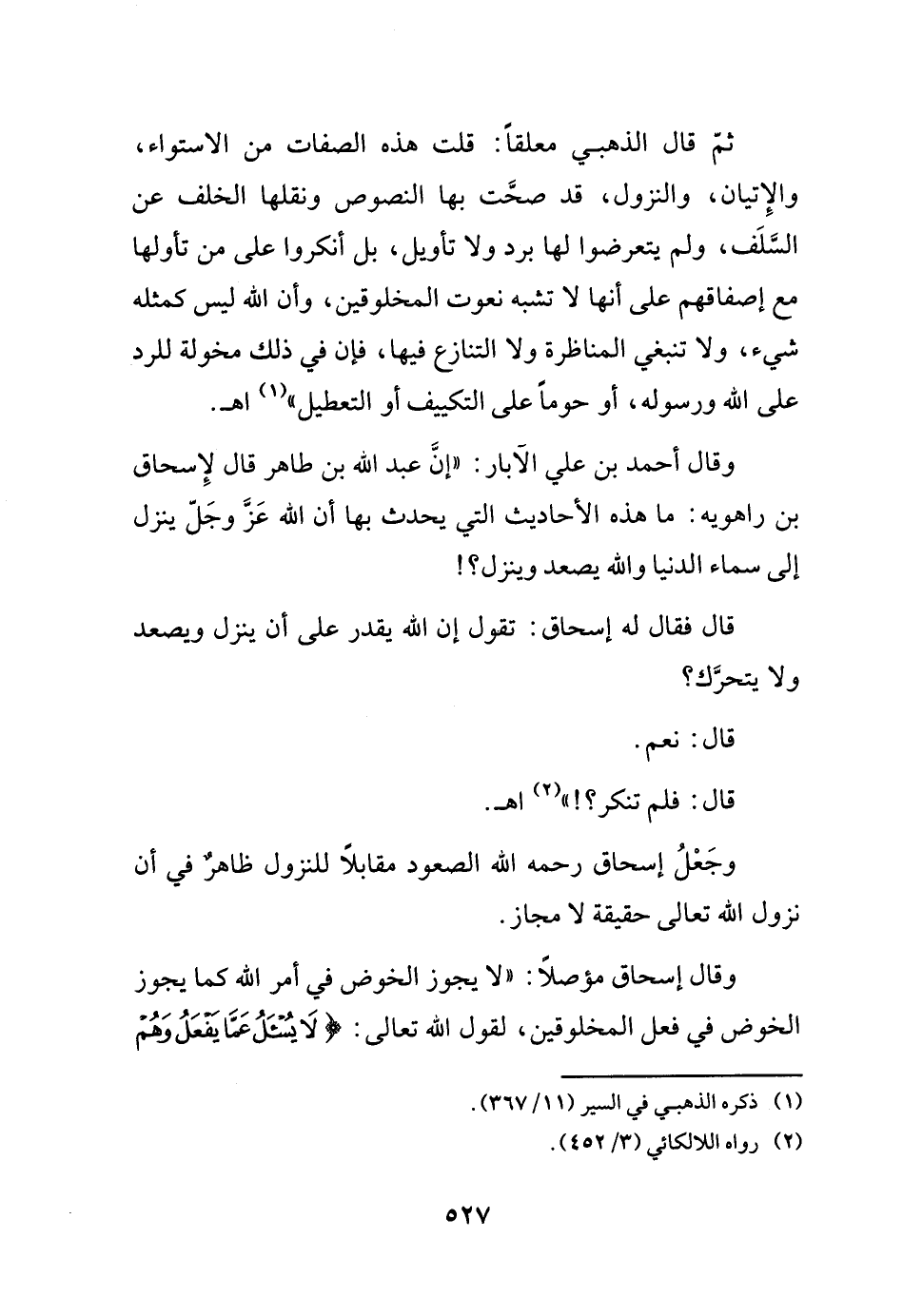 ثم قال الذهبي معلقاً: قلت هذه الصفات من الاستواء، والإتيان، والنزول، قد صحت بها النصوص ونقلها الخلف عن السلف، ولم يتعرضوا لها برد ولا تأويل، بل أنكروا على من تأولها مع إصفاقهم على أنها لا تشبه نعوت المخلوقين، وأن الله ليس كمثله شيء، ولا تنبغي المناظرة ولا التنازع فيها، فإن في ذلك مخولة للرد على الله ورسوله، أو حوماً على التكييف أو التعطيل.) (¬1) اهـ.