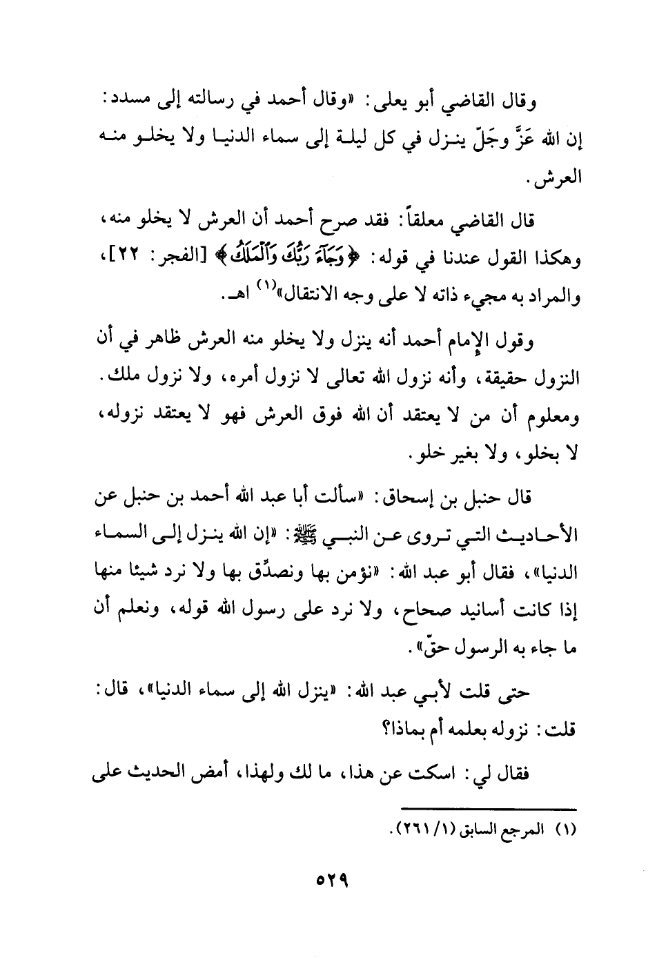 وقال القاضي أبو يعلى: (وقال أحمد في رسالته إلى مسدد: إن الله عز وجل ينزل في كل ليلة إلى سماء الدنيا ولا يخلو منه العرش.