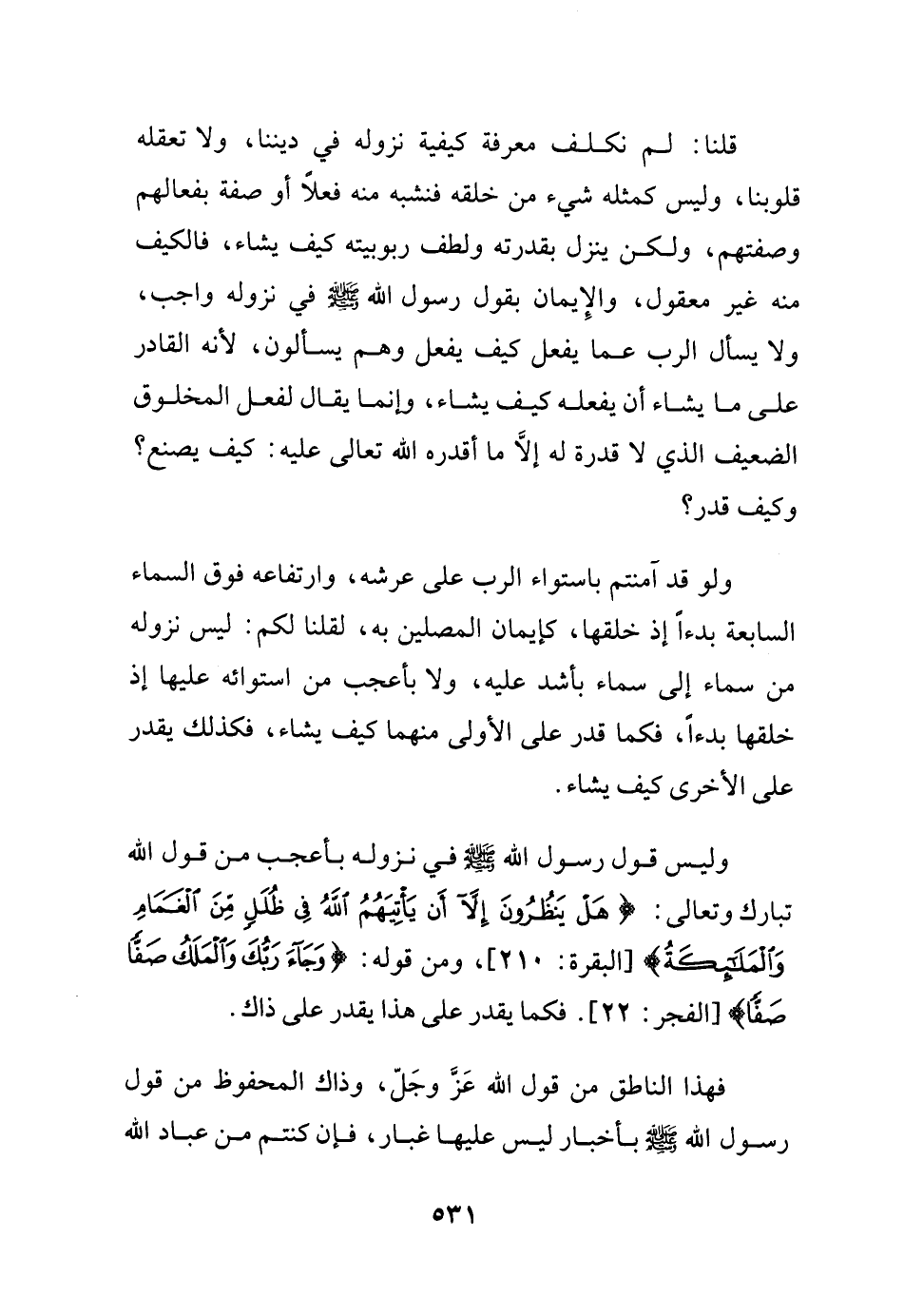 وليس قول رسول الله - صلى الله عليه وسلم - في نزوله بأعجب من قول الله تبارك وتعالى: {هل ينظرون إلا أن يأتيهم الله في ظلل من الغمام والملائكة} البقرة210. ومن قوله: {وجاء ربك والملك صفا صفا} الفجر22. فكما يقدر على هذا يقدر على ذاك.