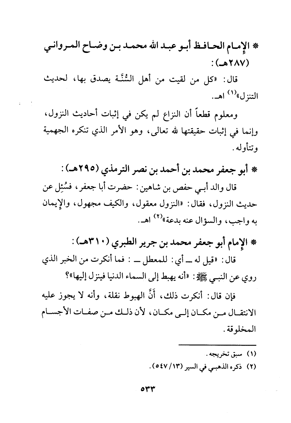 قال والد أبي حفص بن شاهين: حضرت أبا جعفر، فسئل عن حديث النزول، فقال: (النزول معقول، والكيف مجهول، والإيمان به واجب، والسؤال عنه بدعة) (¬2) اهـ.