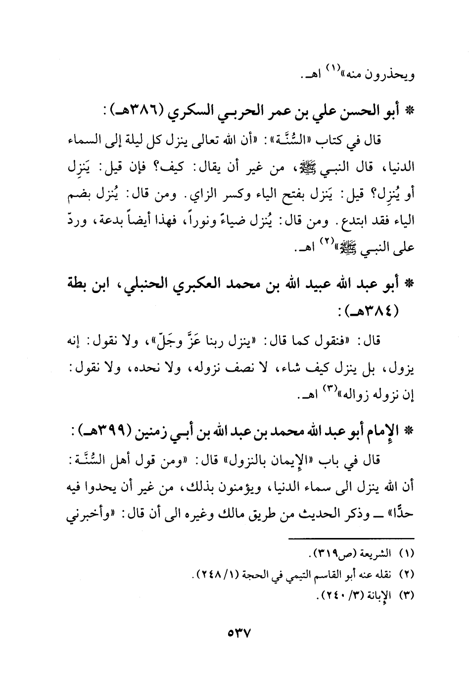 قال فى باب "الإيمان بالنزول" قال: (ومن قول أهل السنة: أن الله ينزل الى سماء الدنيا، ويؤمنون بذلك، من غير أن يحدوا فيه حداً،) -وذكر الحديث من طريق مالك وغيره الى أن قال: (وأخبرنى
