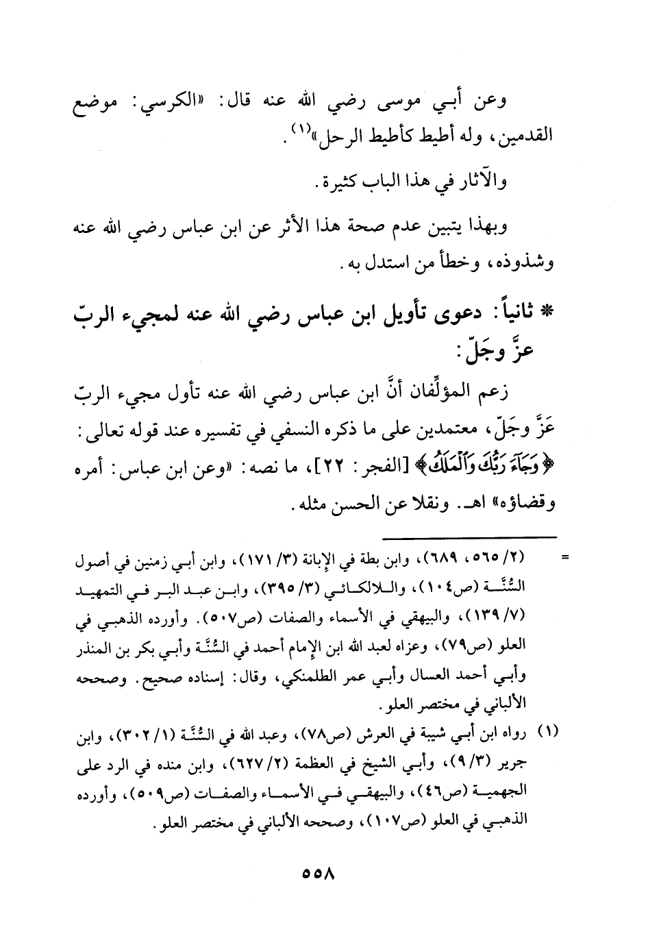 (¬1) رواه ابن أبي شيبة في العرش (ص78) وعبد الله في السنة (1/ 302) وابن جرير (3/ 9) وأبي الشيخ في العظمة (2/ 627) وابن منده في الرد على الجهمية (ص46) والبيهقي في الأسماء والصفات (ص509) وأورده الذهبي في العلو (ص107) وصححه الألباني في مختصر العلو.