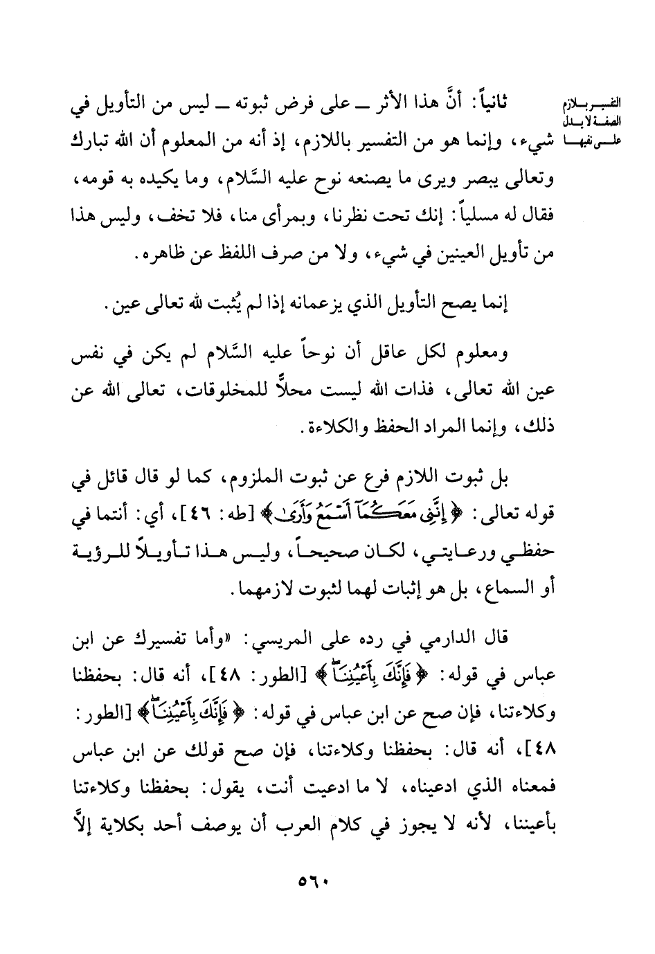 قال الدارمي في رده على المريسي: (وأما تفسيرك عن ابن عباس في قوله: {فإنك بأعيننا} الطور 48، أنه قال: بحفظنا وكلاءتنا، فإن صح عن ابن عباس في قوله: {فإنك بأعيننا} الطور 48، أنه قال: بحفظنا وكلاءتنا، فإن صح قولك عن ابن عباس فمعناه الذي ادعيناه، لا ما ادعيت أنت، يقول: بحفظنا وكلاءتنا بأعيننا، لأنه لا يجوز في كلام العرب أن يوصف أحد بكلاية إلا