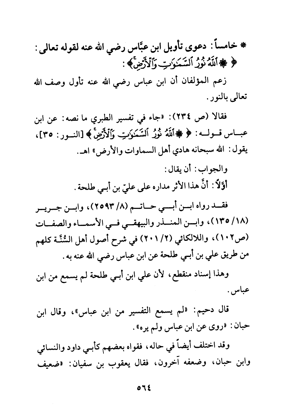 خامساً: دعوى تأويل ابن عباس - رضي الله عنه - لقوله تعالى {الله نور السموات والأرض}: