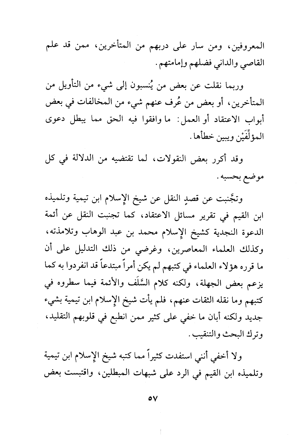 وقد تجنبت عن قصد النقل عن شيخ الإسلام ابن تيمية، وتلمكيذه ابن القيم في تقرير مسائل الاعتقاد، كما تجنبت النقل عن أئمة الدعوة النجدية كشيخ الإسلام محمد بن عبد الوهاب، وتلامذته، والعلماء المعاصرين، وغرضي في ذلك التدليل على أن ما قرره هؤلاء العلماء في كتبهم لم يكن أمراً مبتدعاً قد انفردوا به كما يزعم بعض الجهلة، ولكنه كلام السلف والأئمة فيما سطروه في كتبهم، وما نقله الثقات عنهم، فلم يأت شيخ الإسلام ابن تيمية بشيء جديد ولكنه أبان ما خفي على كثير ممن انطبع في قلوبهم التقليد، وترك البحث والتنقيب.